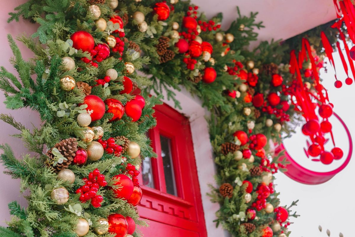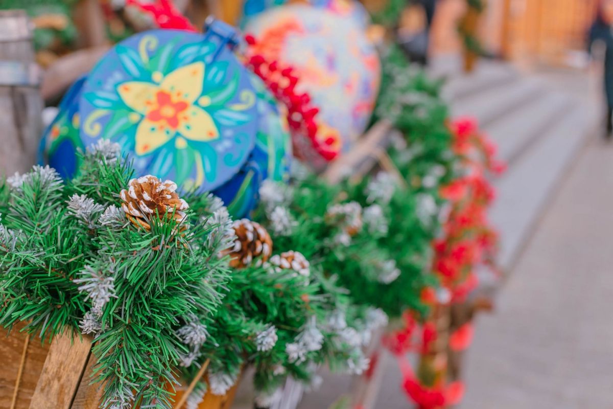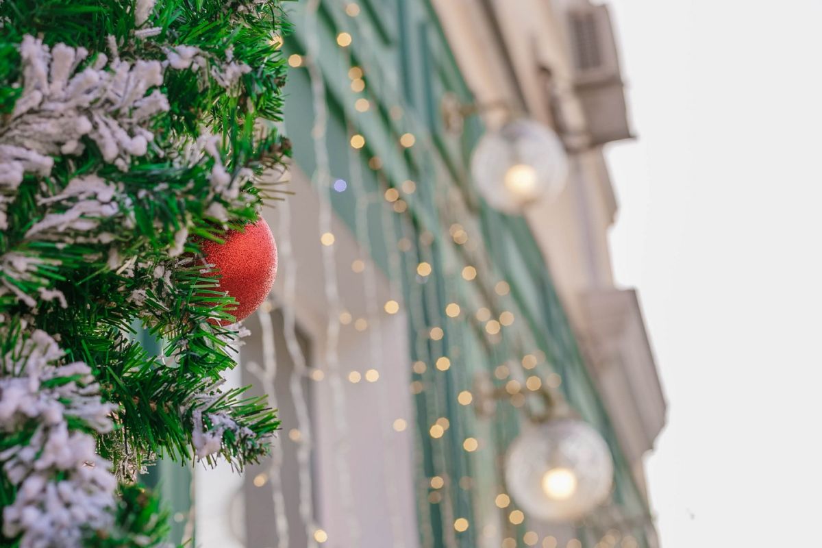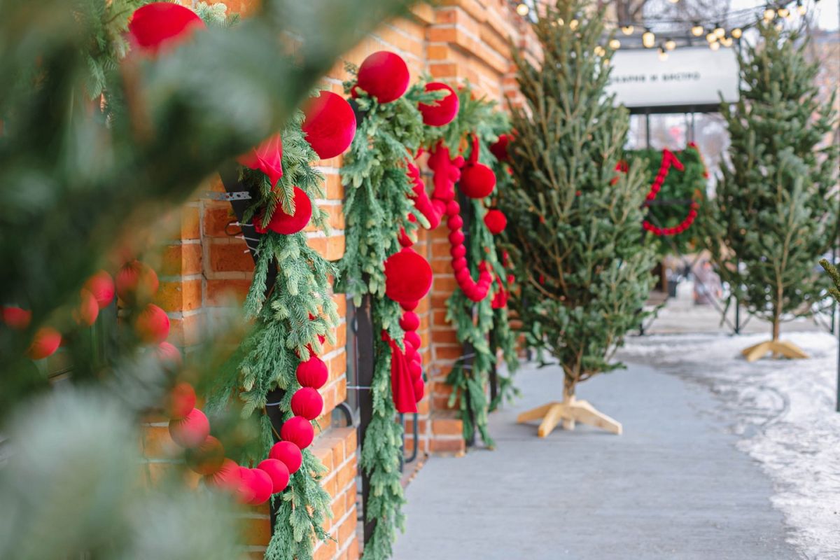 Оформление городского центра началось еще в ноябре. Ночные улицы освещены гирляндами, на фонарях развешаны большие красные шары. Некоторые заведения используют для декора натуральные еловые ветви, другие создают композиции из шишек и красно-розовых лент.