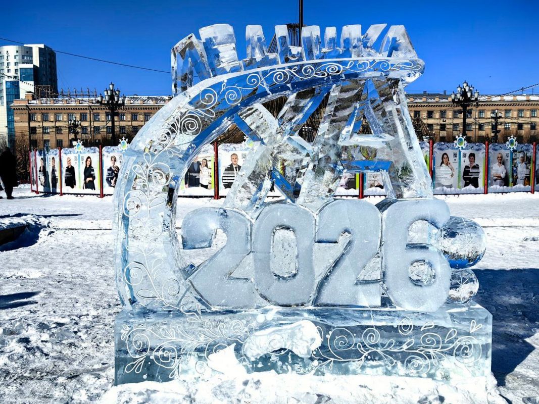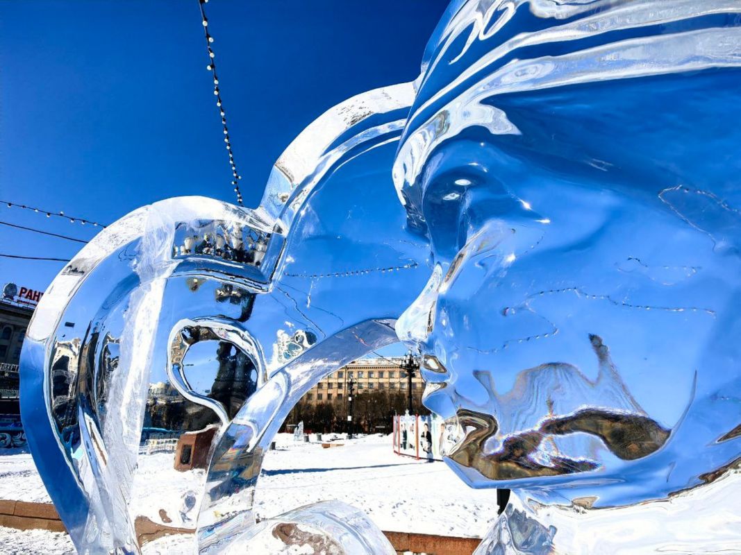 Площадь Ленина в Хабаровске преобразилась в настоящую ледовую галерею. Недалеко от традиционных праздничных елей, символизирующих районы края, теперь сияют хрустальные скульптуры, созданные руками молодых мастеров.