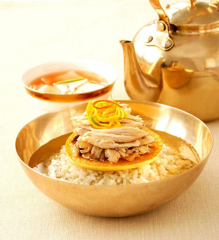 Метод приготовления: на вареный рис положив жареные грибы, кусочки курятины, блины из маша, мелко нарезанные яичницы и перец, добавить толченый кунжут с солью. А затем налить теплый куриный бульон и дать на стол.