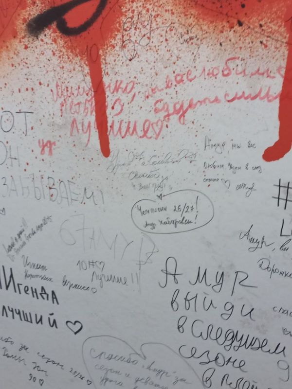 В этот раз вместо отдельных именных карточек использовались плакаты — по размеру они напоминали хлопушки, которые раскладывают на секторах во время матчей. Желающих принять участие оказалось настолько много, что в какой‑то момент двери зала пришлось закрыть: помещение уже было переполнено.