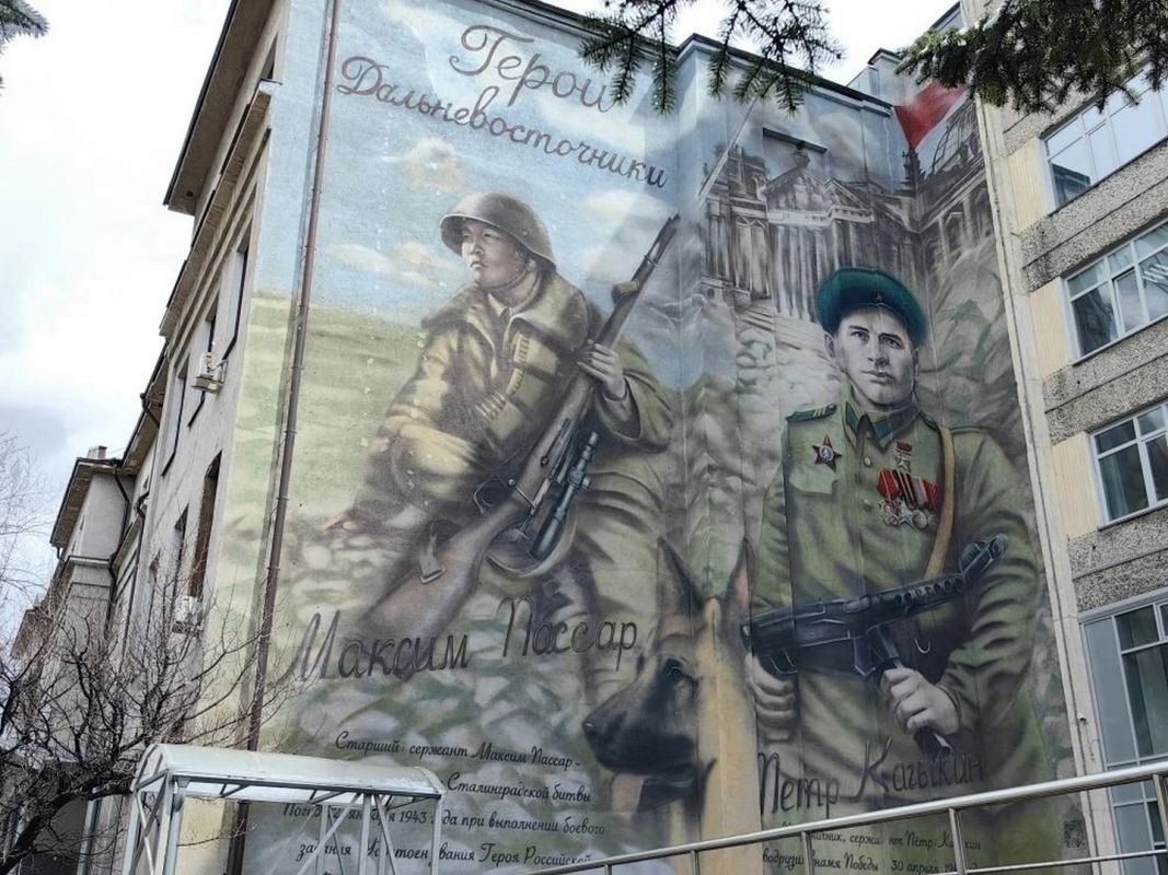 Первые работы уже радуют горожан. Кроме портрета Василевского, в прошлом году появился мурал «Герои-дальневосточники». Он украшает фасад учебного корпуса N 2 Дальневосточного государственного медицинского университета. Вглядитесь в эти лица — Максим Пассар. Уроженец Нанайского района. Снайпер, от которого враги дрожали. 237 уничтоженных солдат и офицеров. Два ордена Красного Знамени. Один — уже после смерти. Ему было всего 19 лет, когда он погиб в 1943 году.