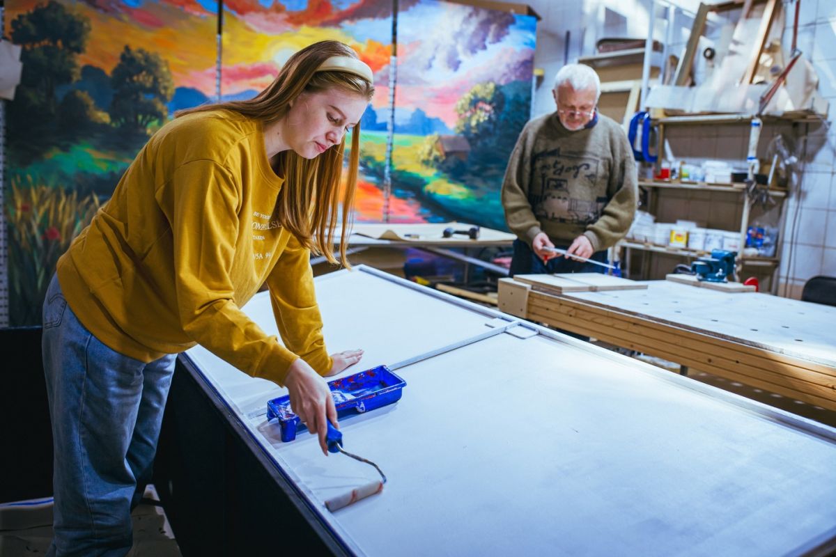 Затем эстафету принимает художественно-декорационная мастерская. Там вдыхают в заготовки жизнь и цвет. Именно их кисти и краски создают ту самую визуальную атмосферу, которая переносит зрителя в нужное время и место. Они расписывают декорации, превращая грубый холст в небесный свод, старинный гобелен или бальный зал.