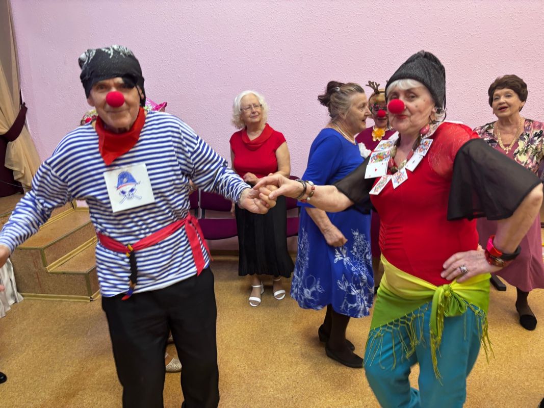 В этот день в «Истоке» сегодня работал закон: «Чем безумнее наряд, тем громче смех». Заглядываем в зал а там важно вышагивает клоун в рыжем парике и ярких ботинках. Рядом настоящий скоморох в расшитой рубахе. А в углу пританцовывает пират! С повязкой на глазу и серьгой в ухе. Ему, между прочим, хорошо за 70.