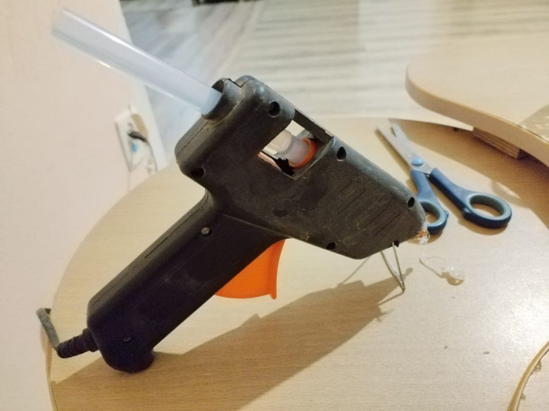 У нас на середине работы новенький пистолет сломался — перестал продвигать клеевой стержень. Пришлось его проталкивать пальцем. Плюс из его «ствола» постоянно стекал расплавленный клей тогда, когда нам это не нужно было. И на рабочем столе образовались потеки. Они, к счастью, легко убираются, когда застынут.