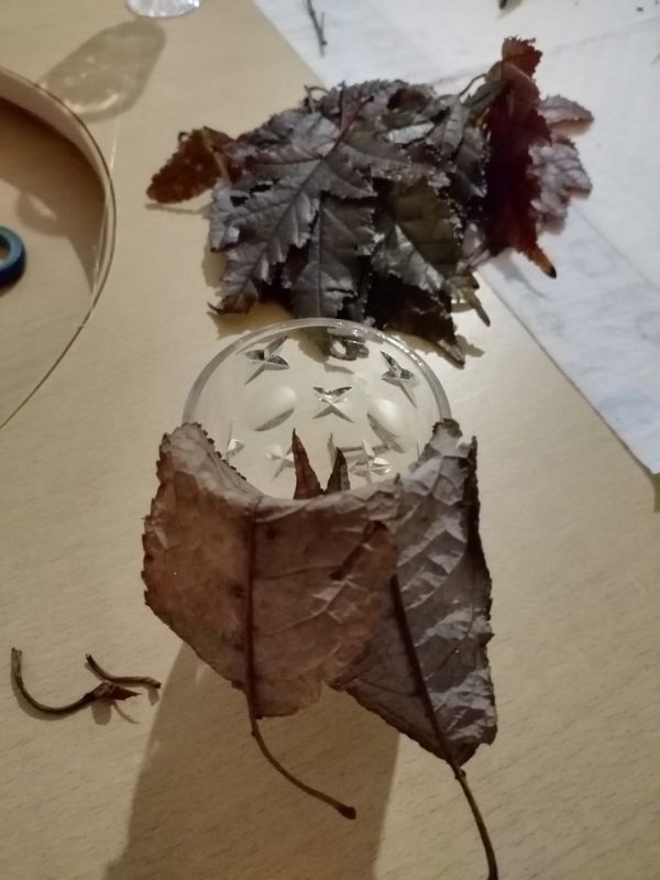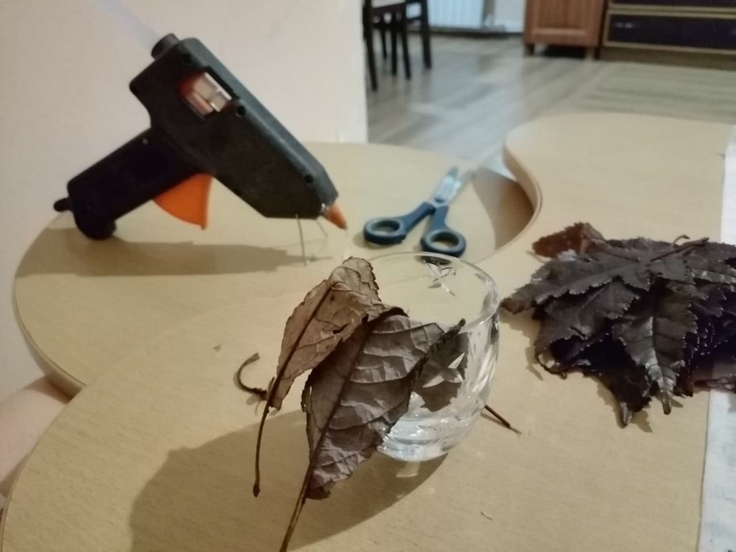 Листья надо сгибать пополам и укладывать по окружности рюмки внахлест — черешки листьев предварительно срезать ножницами и эту часть загибать наружу. Там, где следующий листок наслаивается на предыдущий, промазывать соединение клеем.
