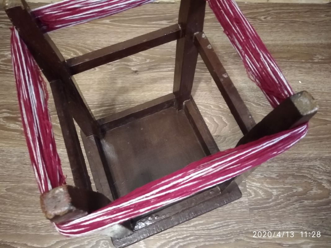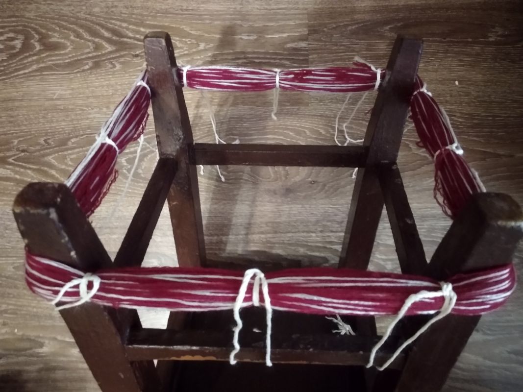 Переворачиваем табуретку кверху ножками и на одной ножке закрепляем кончик ниток. Это можно сделала кусочком скотча или просто завязать. И обматываем ножки табуретки по кругу. Чем больше намотаете, тем пышнее будет помпон. Если вы работаете вместе с детьми, то процесс изготовления уже на этой стадии можно превратить в весёлую игру.