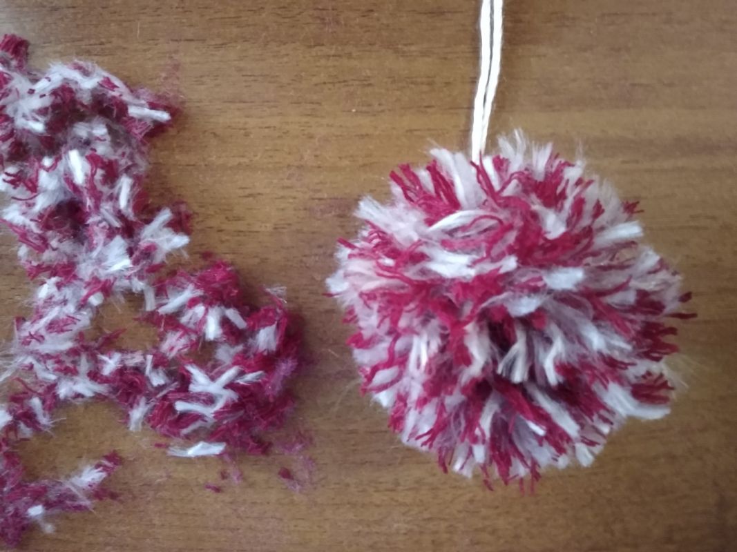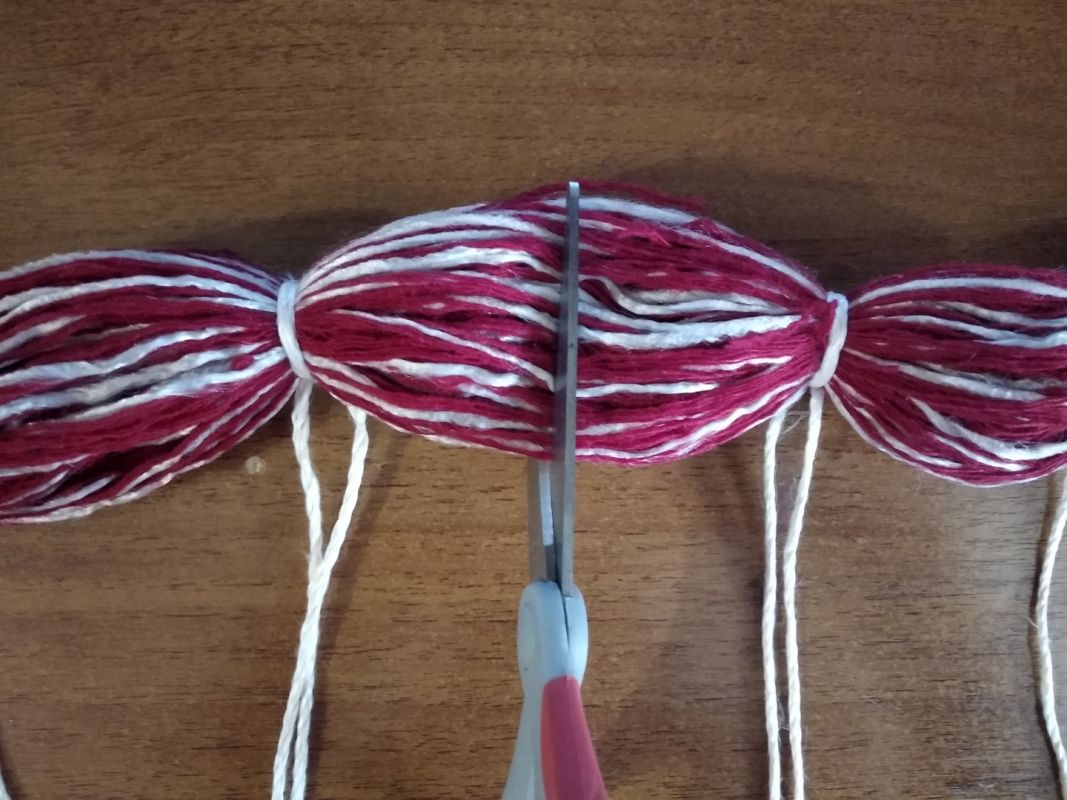 Разлохмачиваем кисти так, чтобы получилось подобие шарика. Аккуратно обрезаем торчащие нити, придавая форму шара. Затем немного покатаем в ладошках (как шарик из пластилина) и ещё подрежем торчащие нити.