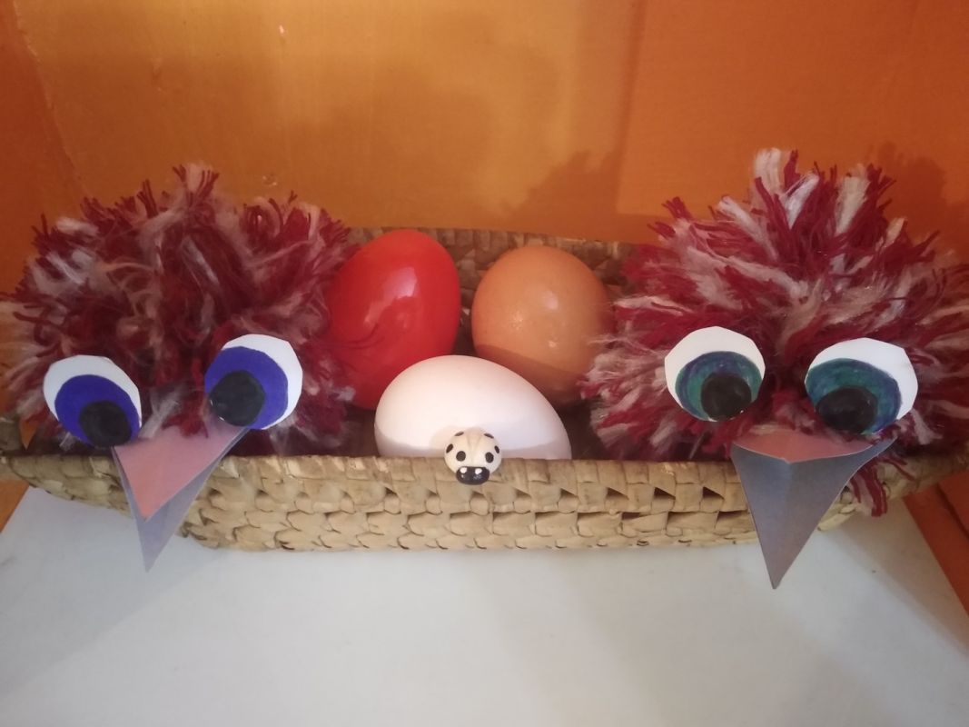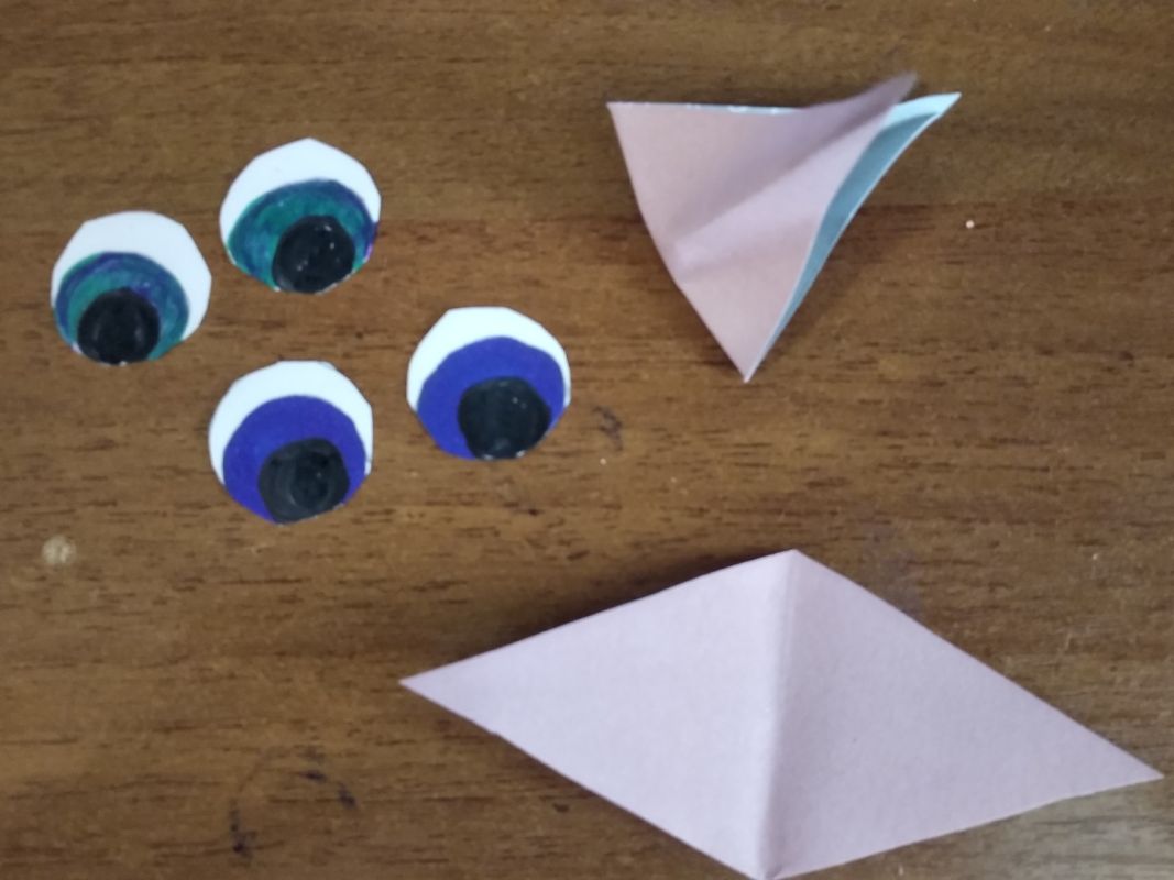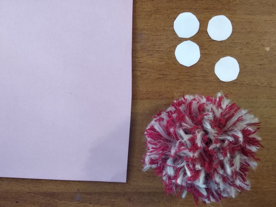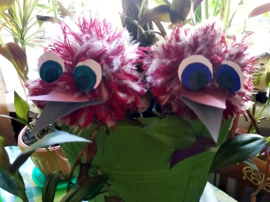 Из белого картона вырезаем кружки и рисуем глазки, а из красного картона вырезаем ромб и делаем клюв. Приклеиваем к помпону глазки и клюв.