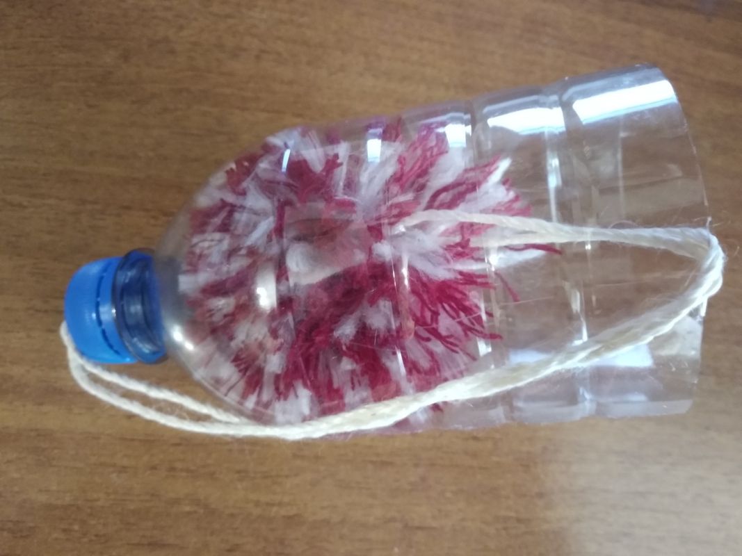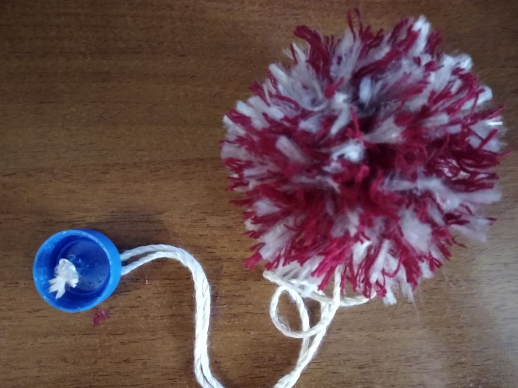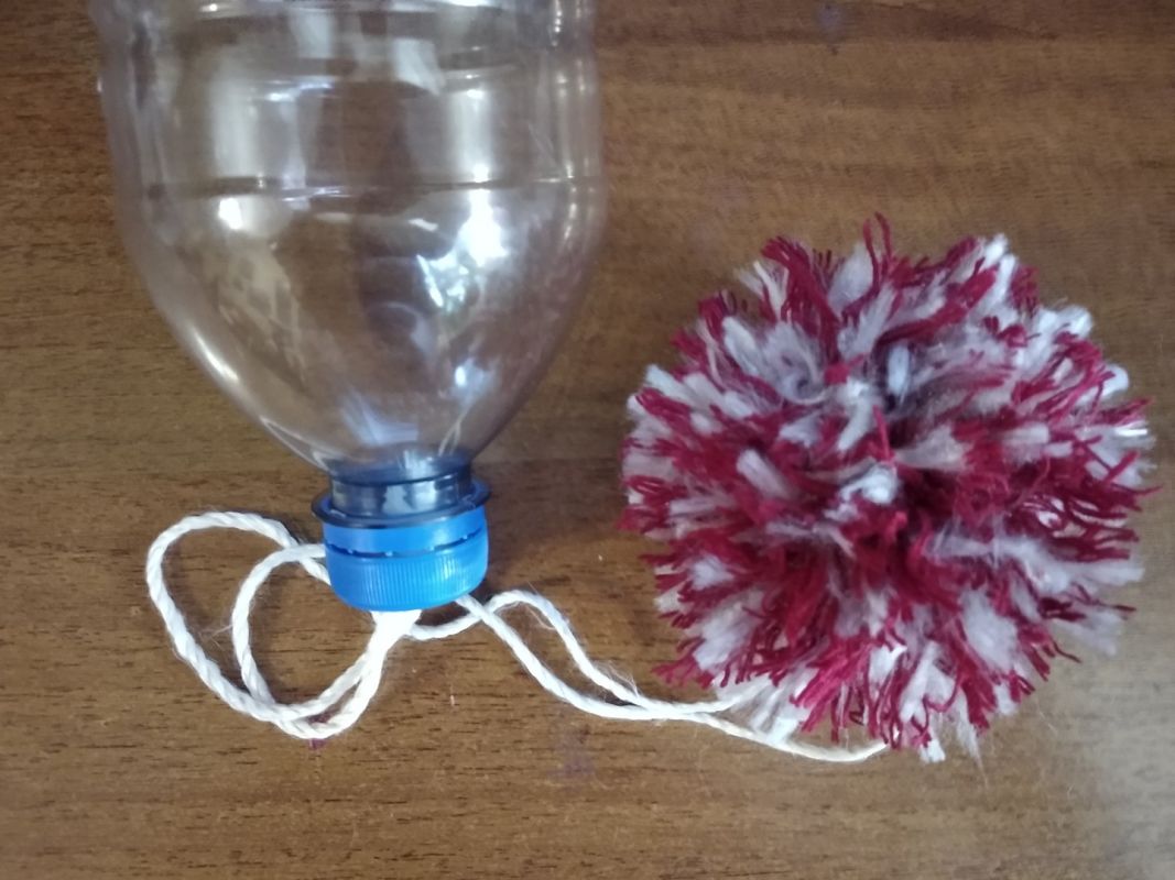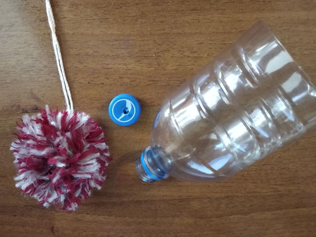Разрезаем пластиковую бутылку. Нам нужна верхняя часть с крышкой. В крышке делаем дырочку, пропускаем в неё верёвочку, которой связан помпон, и закручиваем крышку.