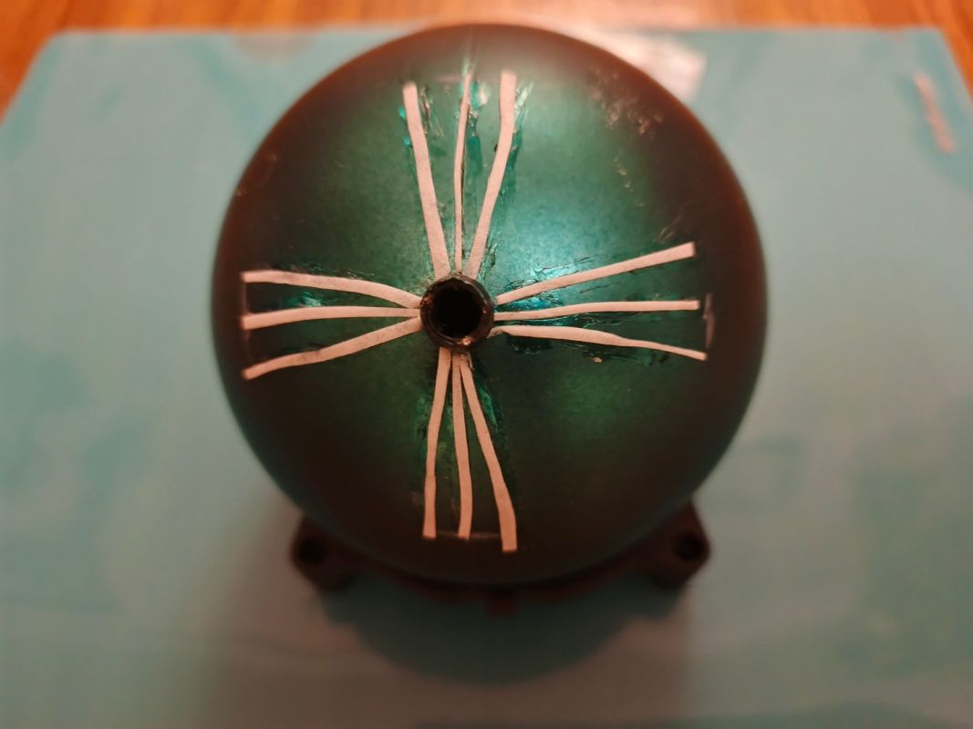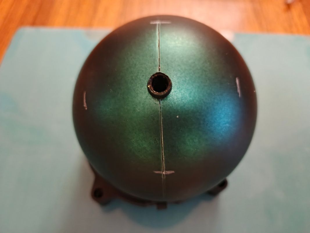 Снимаем подвес, при помощи портняжного сантиметра отмеряем с четырёх сторон по 3 см и делаем отметку карандашом. Желательно, белым, но и простой карандаш будет виден на матовой поверхности шара.