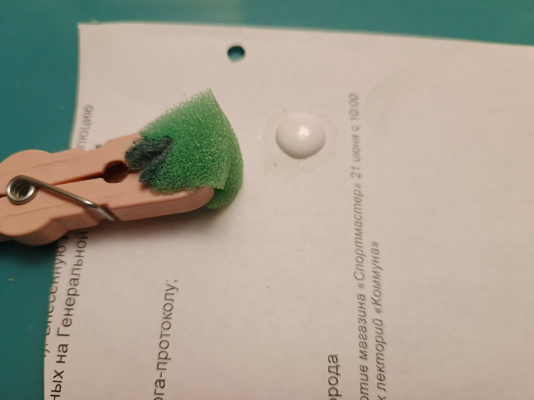 Для этого на лист бумаги кладём немного белой краски. Кусочек губки зажимаем прищепкой. Губку обмакиваем в краску, чпокающим движением на лист сбиваем излишки и так же, «чпокая», покрываем наши ягодки белым «снегом».