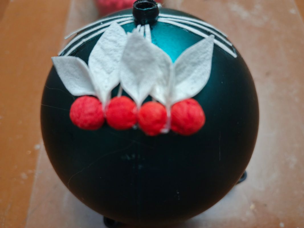 Ёлочный шарик желательно взять зелёного или синего цвета — такое сочетание цветовой палитры выгодно подчеркнёт декор. Диаметр можно взять и больше, но не менее 10 см, иначе наше украшение превратится в нагромождение элементов.