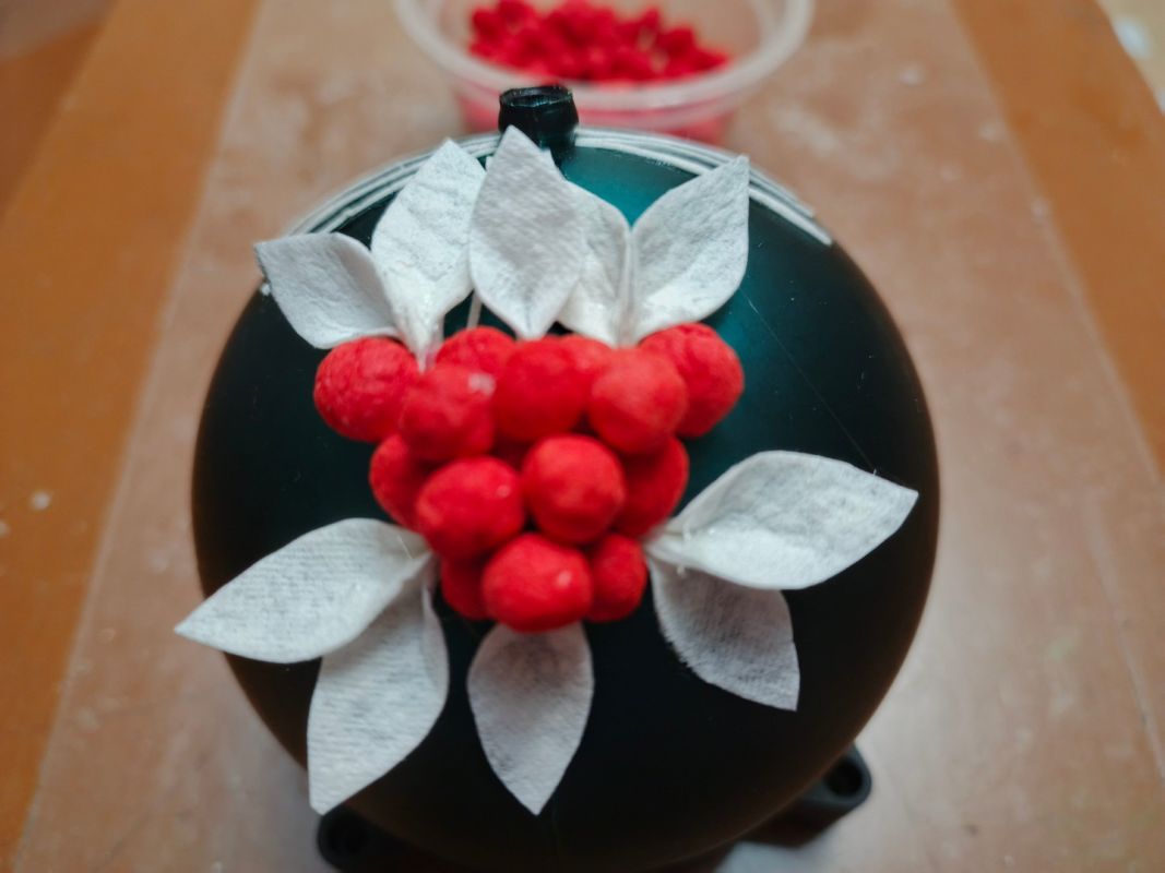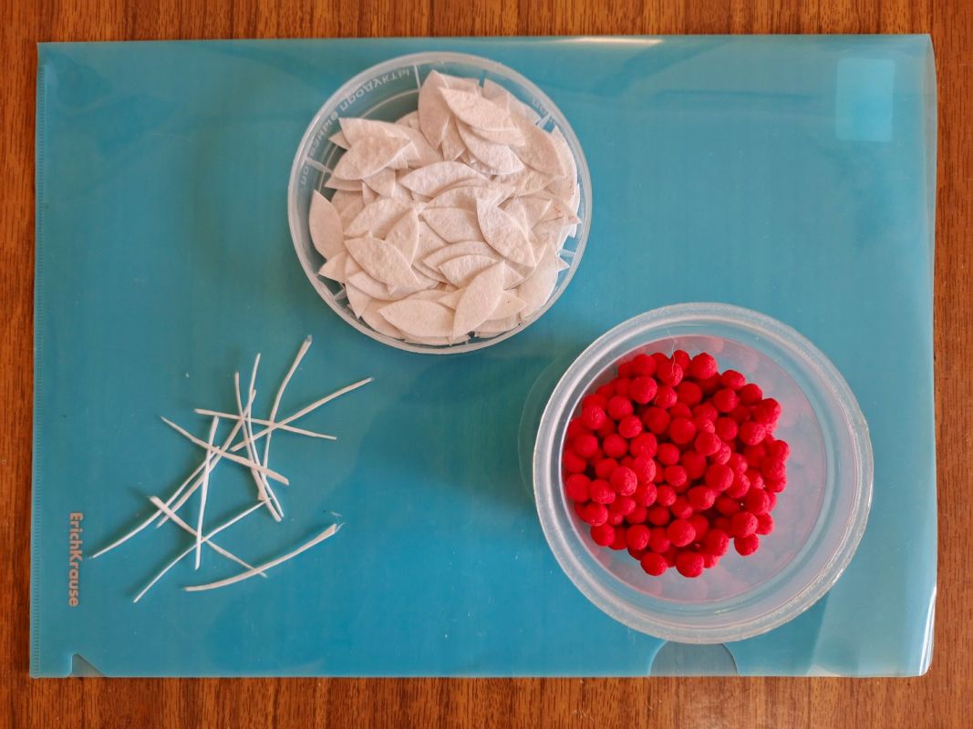 Пока диски сохнут, подготовим ватные шарики. Отрываем маленькие кусочки ваты, промазываем клеем и скатываем шарик не более 5 мм в диаметре. Совсем необязательно, чтобы они были одинакового размера — в природе ведь тоже ягодки разные. Раскладываем шарики на файле для полного высыхания. Затем окрашиваем каждый шарик в красный цвет и ещё раз хорошенько просушиваем. Таких шариков нам понадобится 60 штук.