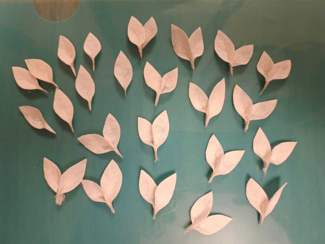 Каждый листик сплющиваем и проклеиваем с одного конца. Нам понадобится 8 одиночных листочков и 16 — парных (склеенных между собой).