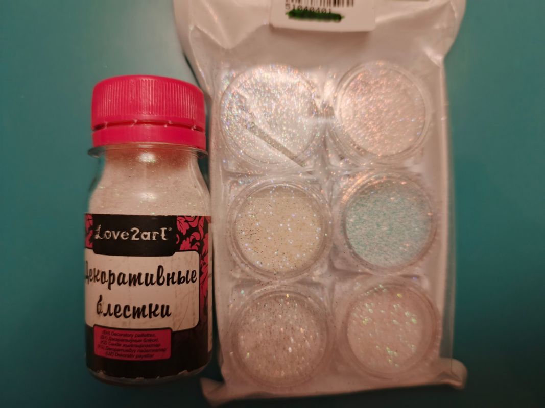 Учтите, что декоративные блёстки (глиттер) должны быть белыми или прозрачными. Можно взять с голографическим эффектом, они больше переливаются. Характеристика глиттера всегда есть на этикетке. Ни в коем случае не берите серебро. Эффект получится обратным — вместо блеска игрушка приобретёт такой вид, словно её измазали жирной грязью. Декоративные блёстки можно заменить глиттером, используемым в маникюре.