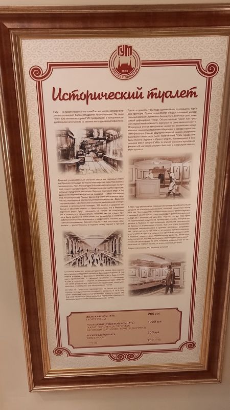 Долго разгуливать по ГУМу не советую — если вам захочется, пардон, в туалет, то не завидуем. Хотя… Туалет в ГУМе называется «Историческим», а значит, посетители там и прикасаются к истории этого полезного со всех сторон учреждения. Там кругом жутко красиво, оформлены стенды с фотографиями, но и вход туда стоит почти как в музей — 200 рублей. Честно признаемся: пожадничали и не пошли.