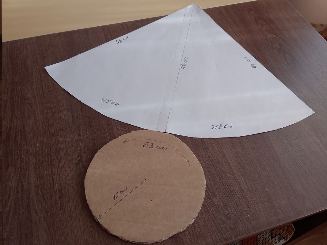 Получившиеся метки соединяем — получается округлая линия низа нашего конуса. С помощью портновского сантиметра откладываем по этой округлой линии в каждую сторону 31,5 см — получаем две нижних точки нашего конуса. Соединяем их с верхней точкой. Конус построен без всякого Пифагора. Вырезаем — выкройка готова.