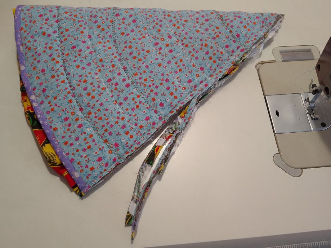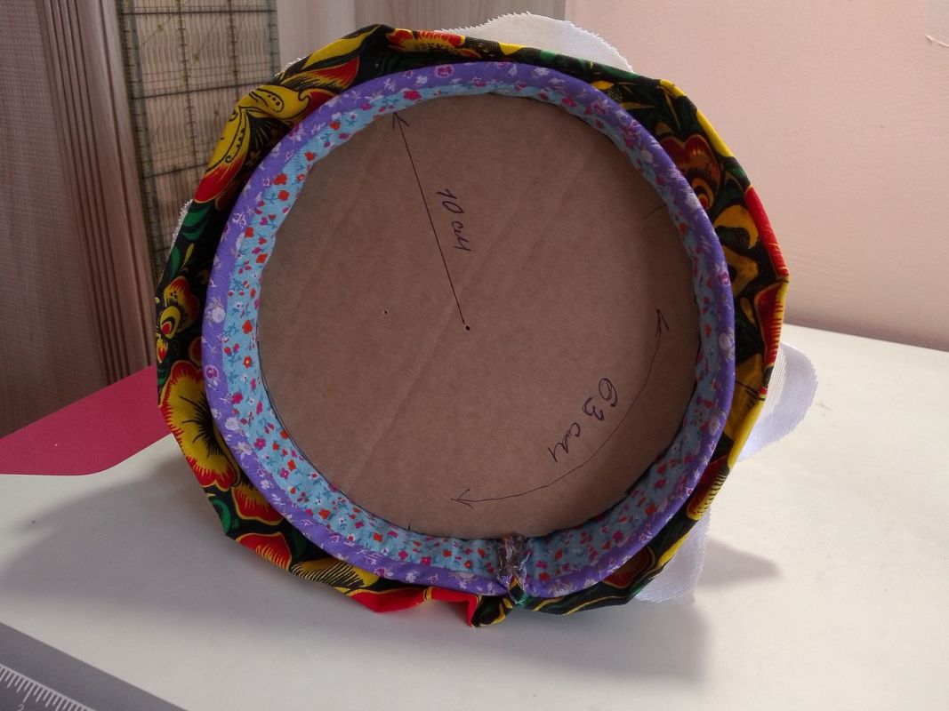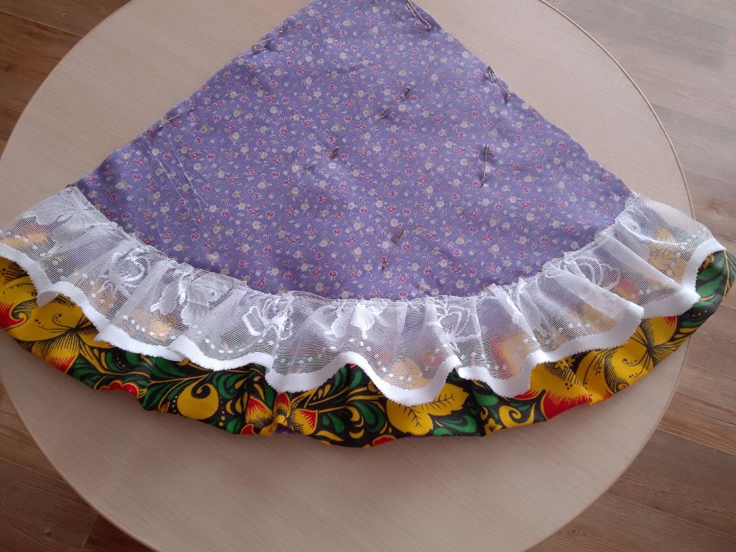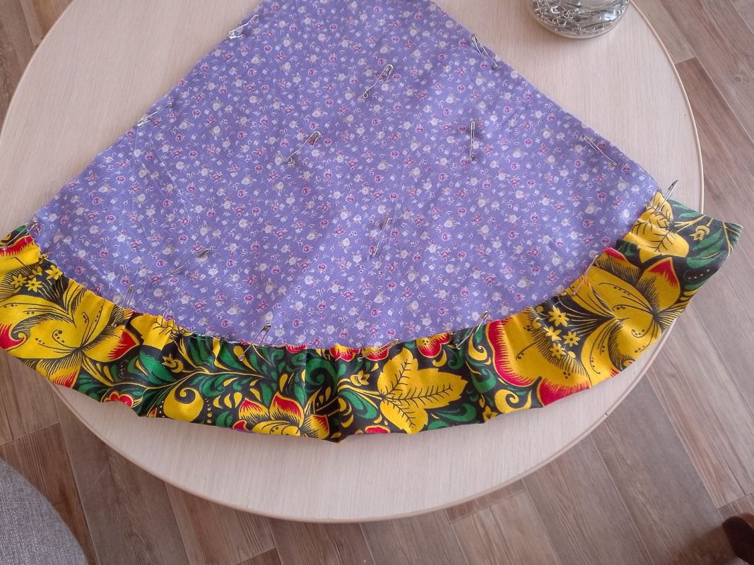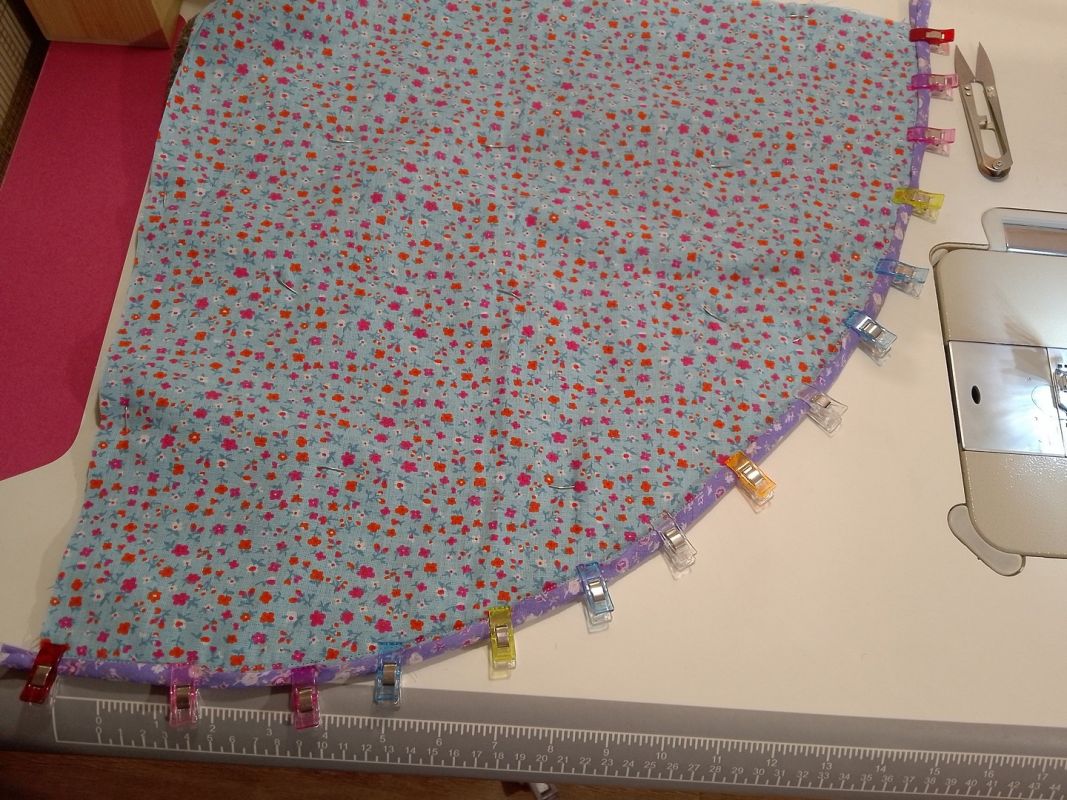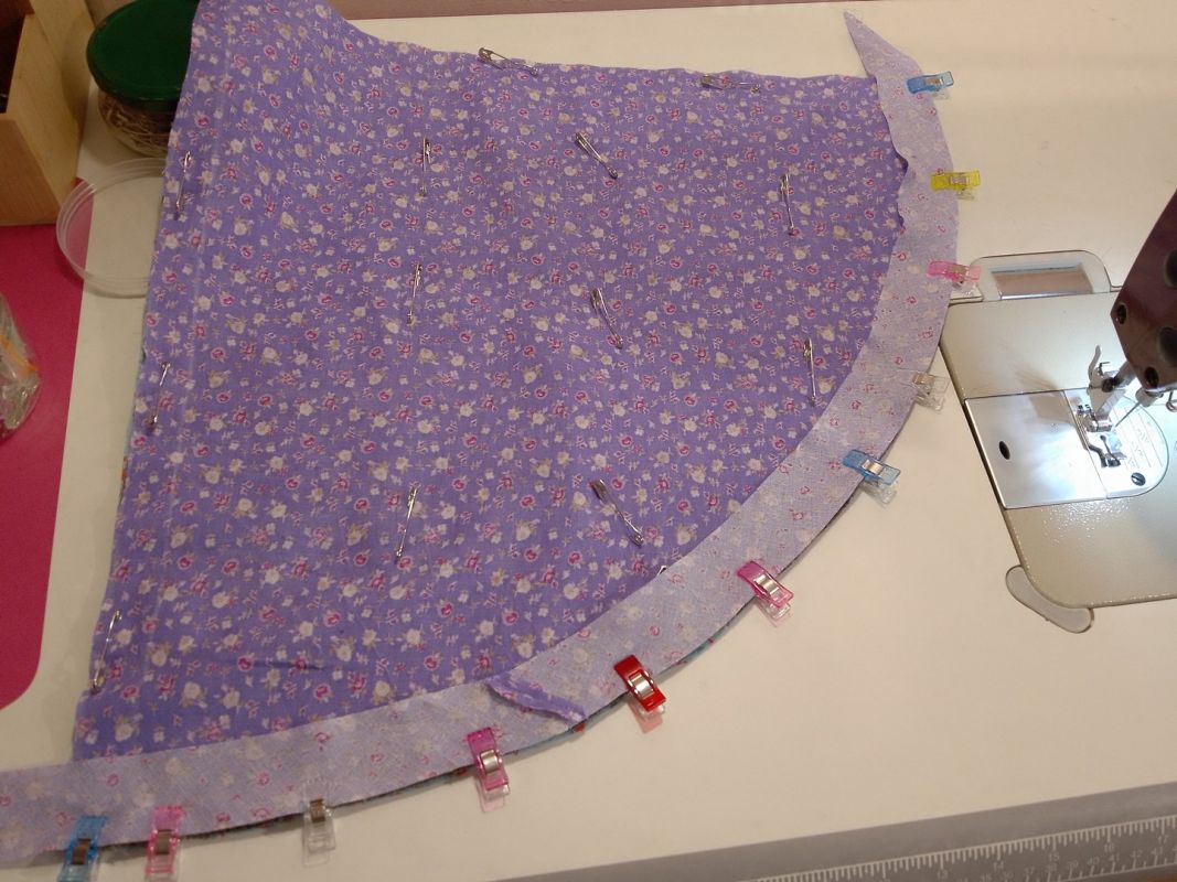 На готовый сэндвич переносим выкройку конуса, делаем припуск с боков по 2-3 см, внизу 0,5 см. Вырезаем. Низ изделия обрабатываем косой бейкой. Здесь удобно использовать для скрепления портновские прищепки. У них одна сторона плоская — ею вниз. Другая выпуклая — ею, соответственно вверх. Так будет удобно прокладывать строчку и убирать их при шитье.