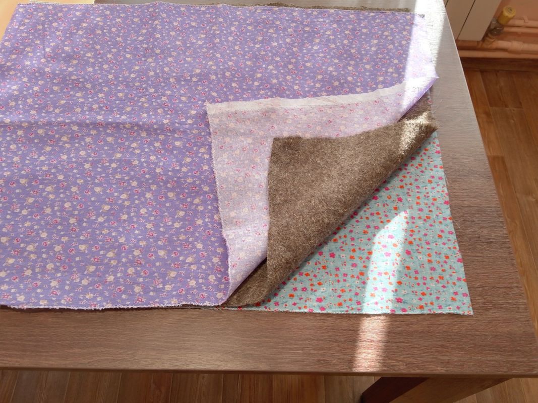 Подготовленные куски ткани и уплотнитель складываем таким образом: сначала, лицевой стороной вниз, — первый лоскут, на него уплотнитель (войлок или ватин), затем еще один лоскут ткани лицевой стороной вверх.