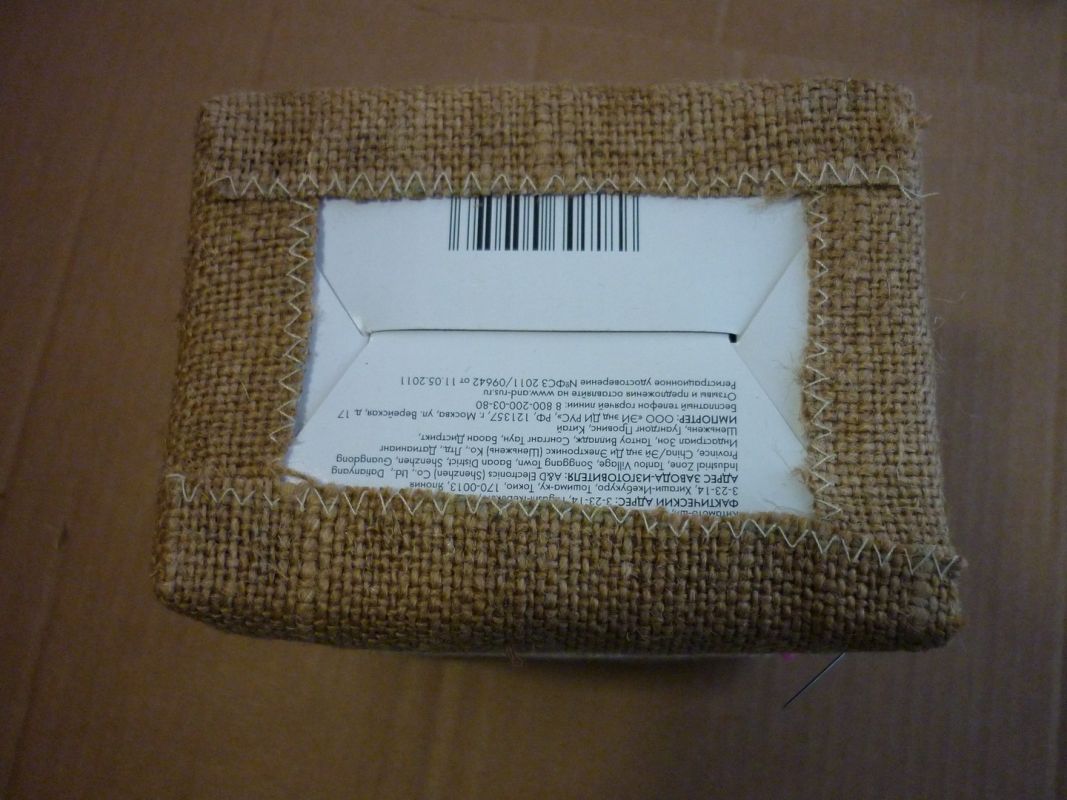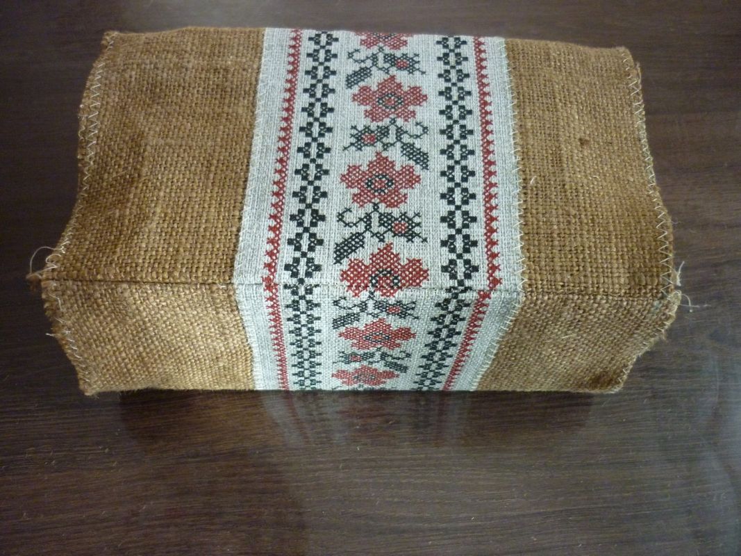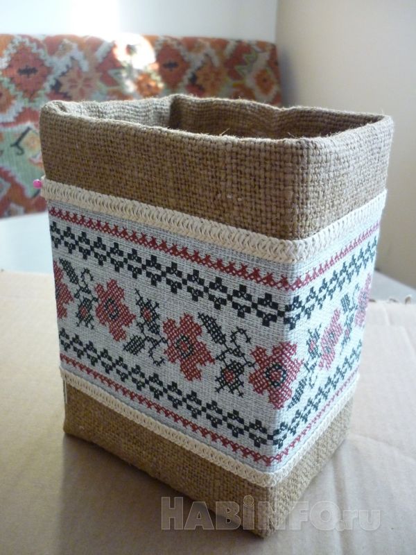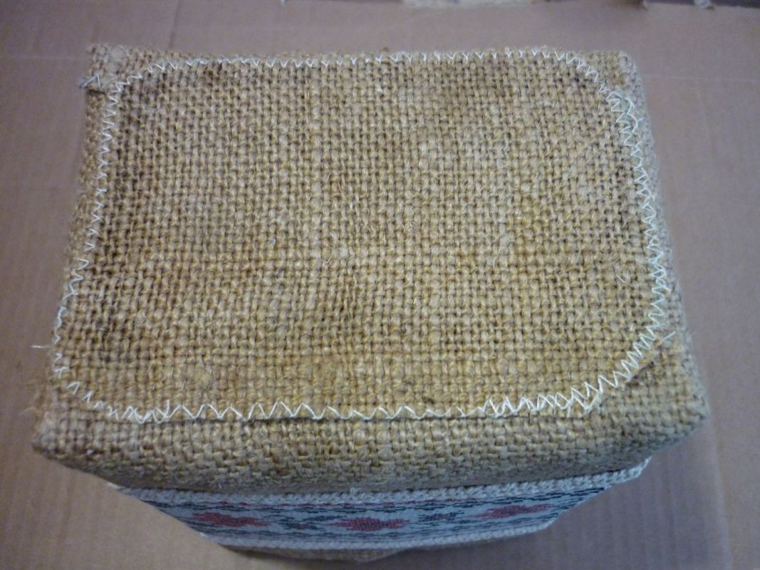 Полоску рогожки наложила на основную деталь из мешковины, пришила швом зигзаг, так же обработала края мешковины. Сшила вместе с изнанки края основной детали, разгладила шов, надела получившуюся трубу на коробку, шов совместила с одной из граней коробки.