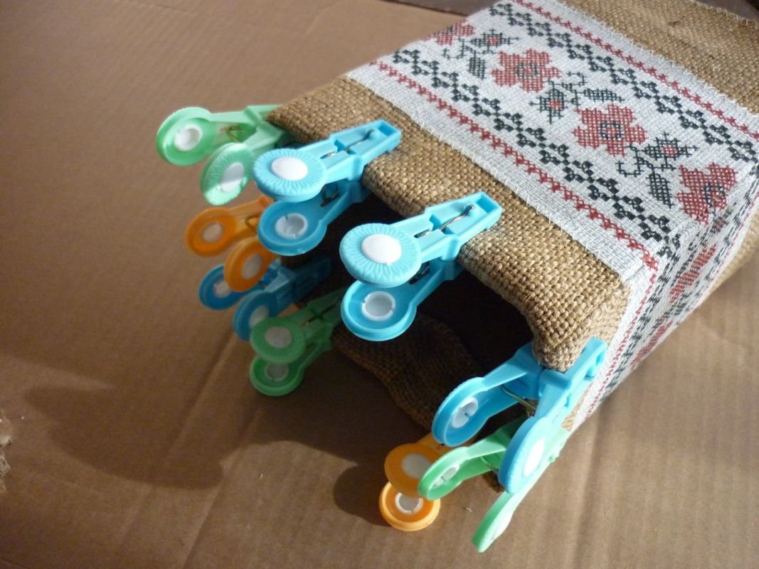 Края мешковины загнула вверху внутрь коробки, внизу — к днищу. Приклеила сначала верх, для надежности края закрепила прищепками. Когда высохло, приклеила днище. Положила груз и тоже дала высохнуть.