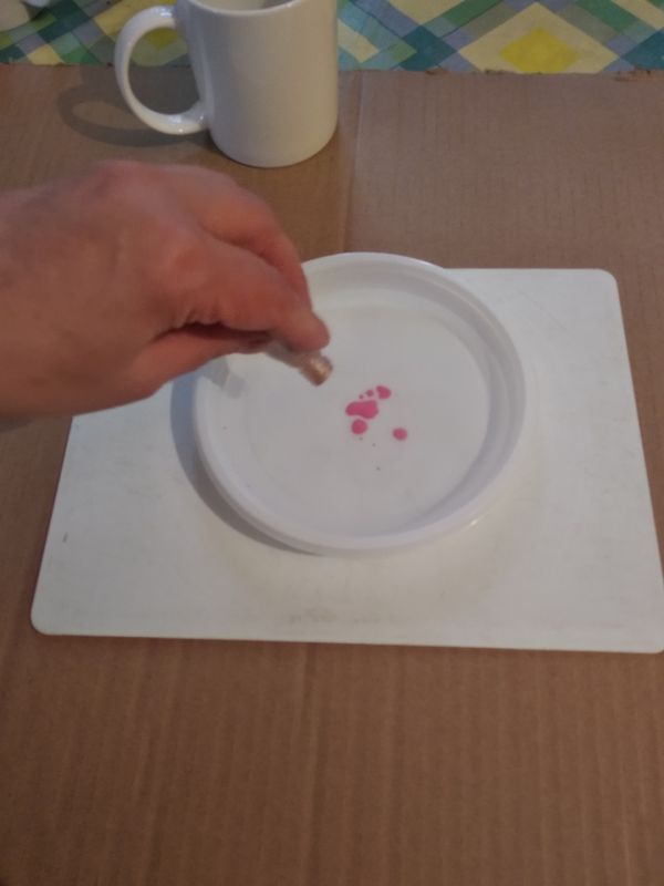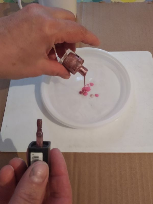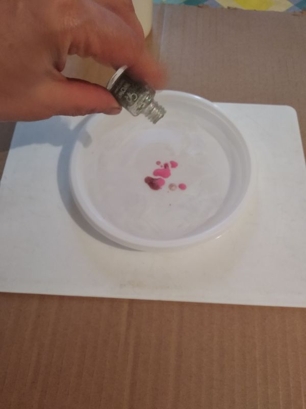 В тарелку наливаем горячую воду (не кипяток!) и капаем в воду лак для ногтей. Капать можно рядом, можно один цвет на другой, можно вообще использовать один цвет. Главное — не замедлять процесс, чтобы лак не успел застыть, так как вода быстро остывает. Данный этап лучше всего провести в проветриваемой комнате.