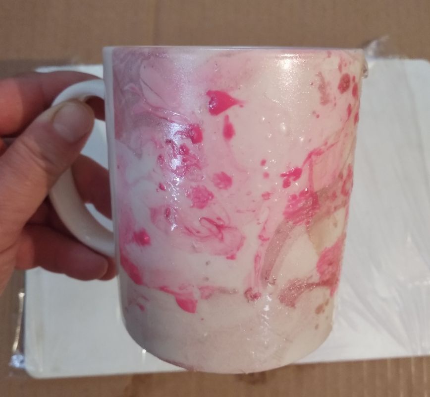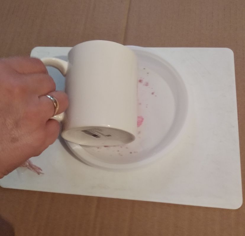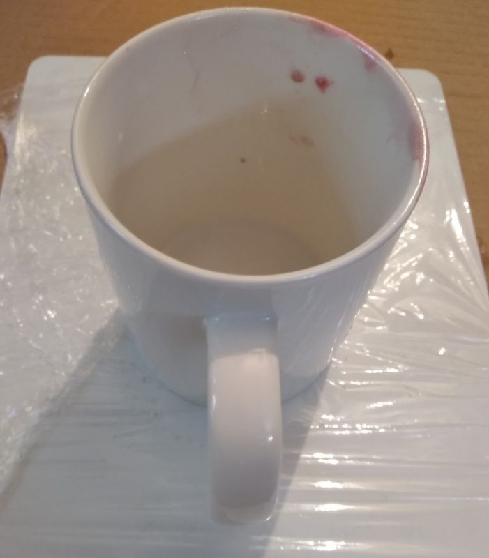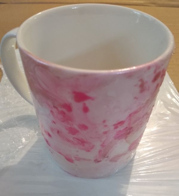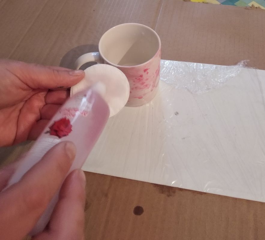 Аккуратно окунаем в воду кружку и поворачиваем её. В этот момент узор из лака прилипает к её поверхности. Доску для лепки заранее закрываем пищевой плёнкой (она имеет свойство прилипать только сама к себе, к поверхности других предметов не прилипает) и ставим сушить нашу кружку приблизительно на 30 минут.