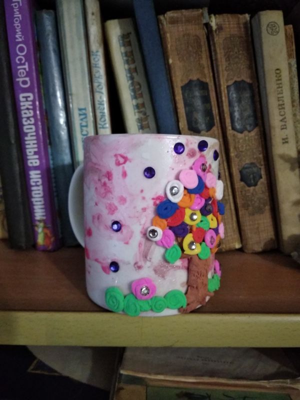 Наша кружка готова. При желании украшаем стразами, бусинками, бисером (что есть под рукой) или присыпаем блёстками.