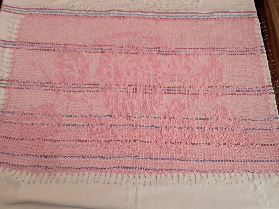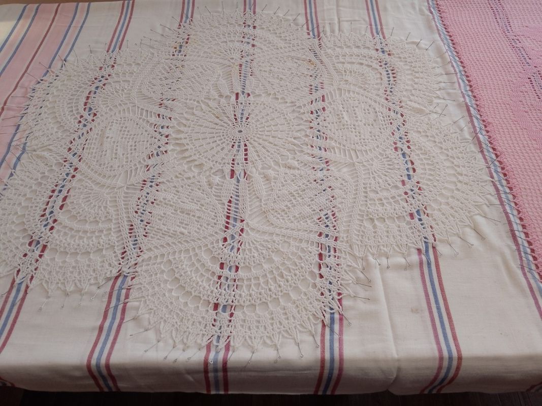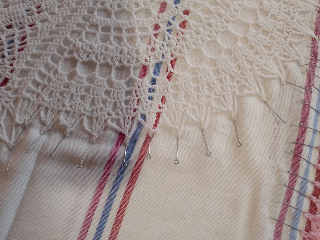 Далее берем портновские булавки и, натягивая кружево, фиксируем салфетку по периметру или окружности, стараясь не пропустить ни одной петельки, ни одного фестончика, выступа. Салфетку в процессе еще слегка подтягиваем, чтобы придать четкость рисунку, но при этом следим, чтобы она приобрела заданную схемой форму.