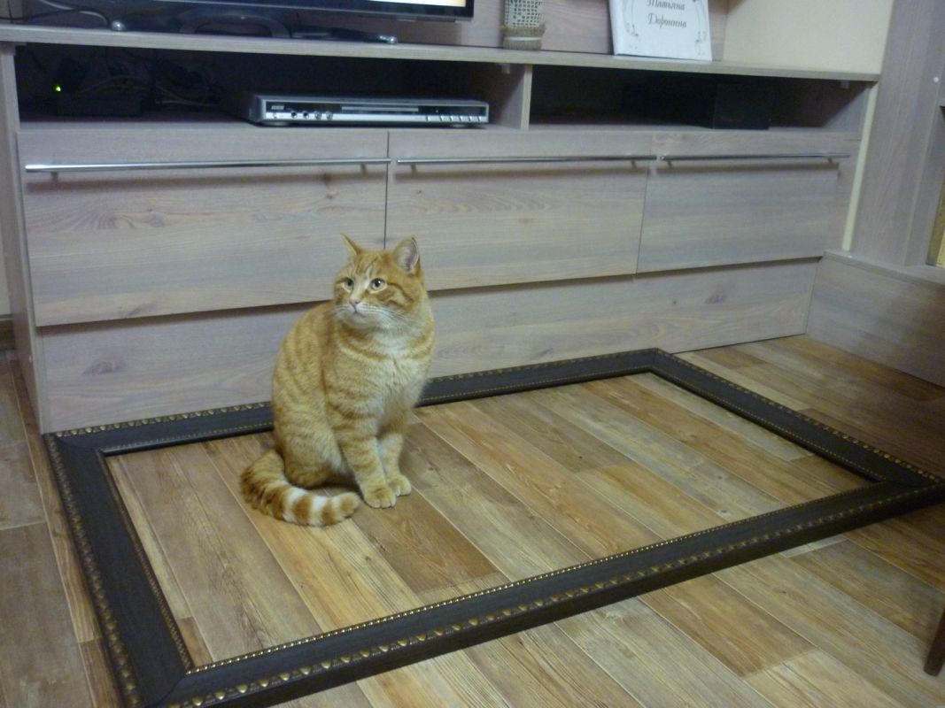 Она требовалась большая. Купили для этого багет в строительном магазине, а саму раму взялся сделать муж. Сначала, разрезав багет на циркулярной пиле подобающим образом, под углом 45 градусов, он его склеил, а затем, для надежности, с обратной стороны прикрутил металлические уголки. Кот заценил. Даже подумал, что мы строим ему домик.