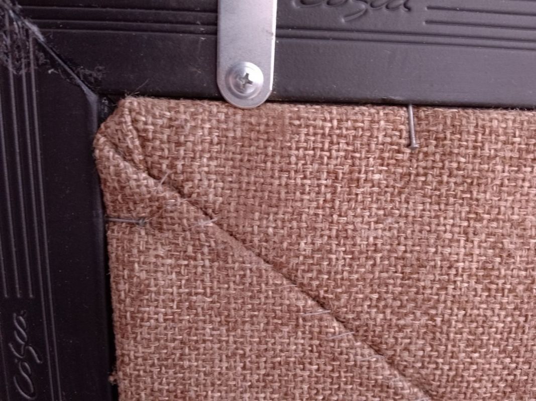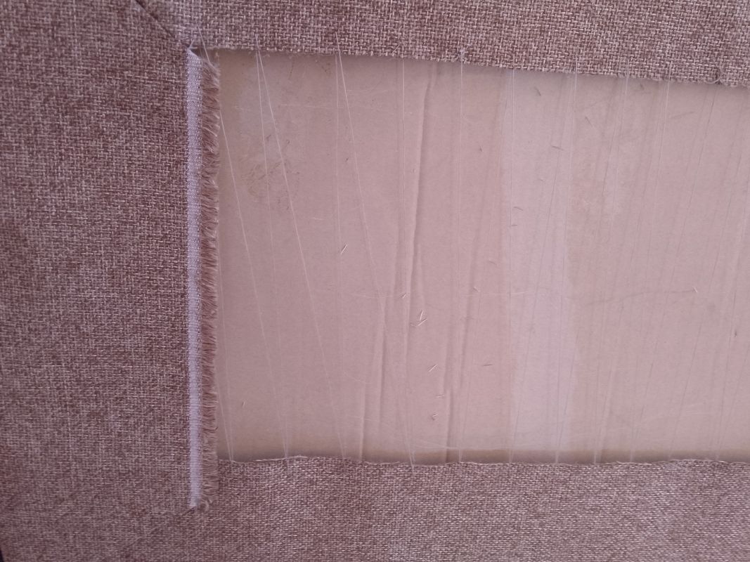 Когда рама была готова, вырезали по размеру кусок картона на подложку, обтянули его тканью. Наверное, с изнанки стоило приклеить ткань к картону, но я ничего лучше не придумала, как по углам сшить, а края стянуть суровой ниткой. Получилось и прочно, и аккуратно.