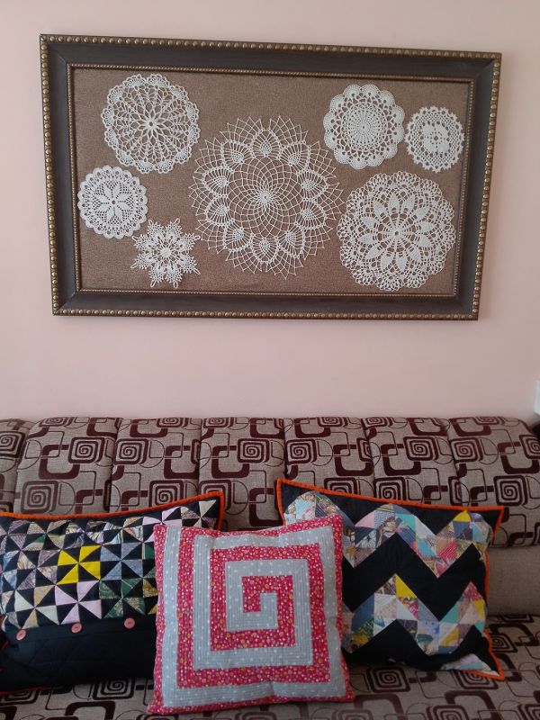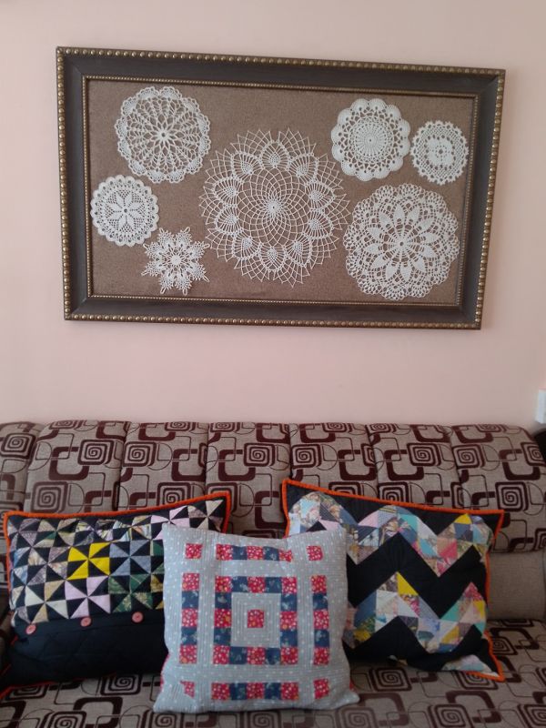 В результате скопилась масса готовых работ. Их, конечно, можно пустить на подарки, разложить в своем жилище по столикам и тумбочкам, но и этого моим работам было мало. Тогда я решила, что вязаным салфеткам самое место на стене — она как раз над диваном пустовала.