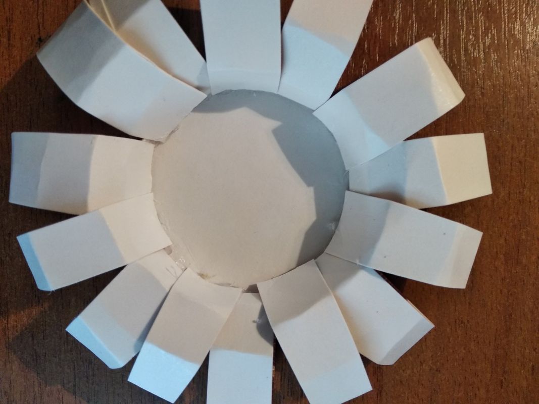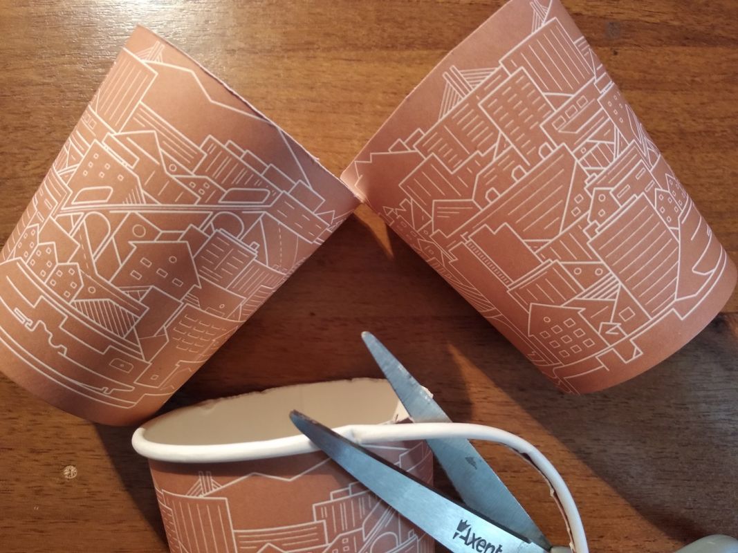 Для того, чтобы сделать цветы, на оставшихся стаканчиках отрезаем верхний закруглённый жёсткий край и разрезаем стенки на полоски. Совсем необязательно, чтобы они были одинаковой ширины, ведь в природе мы тоже не часто видим идеальные пропорции.