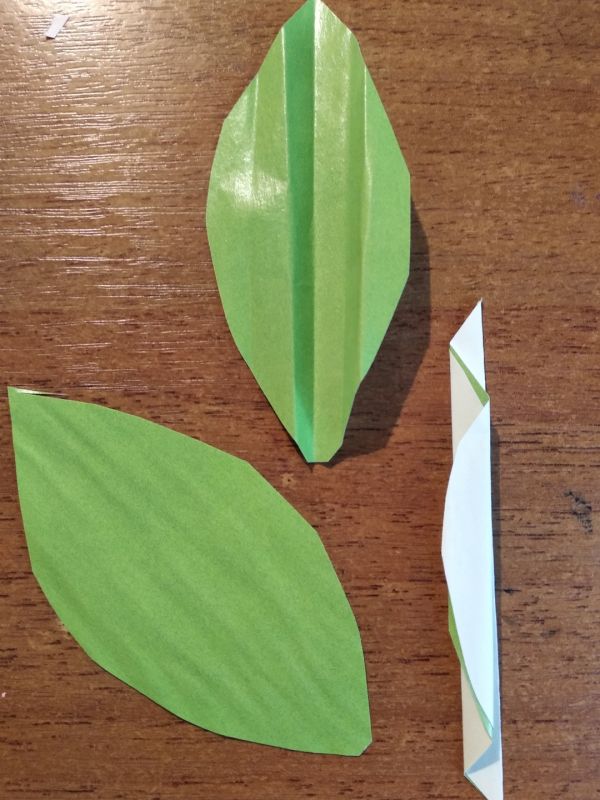 По намеченным линиям приклеиваем тоненькие полоски-стебельки из зелёной бумаги. Из этой же бумаги вырезаем листики. Для визуального объёма складываем их гармошкой, потом выпрямляем. Чтобы ваза не выглядела пустой, два-три листочка приклеиваем по вазе. Для этого один край листа приклеиваем внутри стаканчика, второй — снаружи.