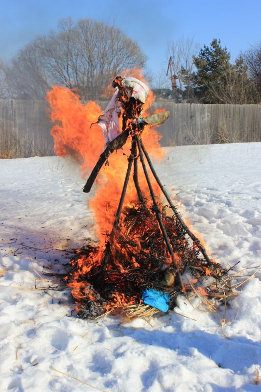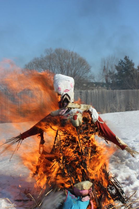 Наконец наигрались. Пора сжигать чучело Масленицы. Выношу тарелку с блинами. И каждый, загадав желание, со словами «Гори, зима, гори, Масленица!», «Уходи, зима сопливая, приходи, весна красна!» бросает свой блин в костер, стараясь попасть на горящее чучело Масленицы.