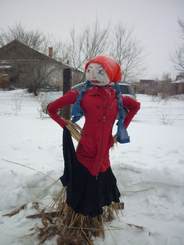 Когда и остов, и голова, и наряд готовы, остается чучело собрать воедино. Платье надевают на остов, набивают его соломой, сеном или сухой травой (об этом стоит позаботиться накануне), а также ненужной бумагой. Затем насаживают и закрепляют голову. Всё, пусть постоит, полюбуется заснеженными окрестностями. Людям пора за стол…