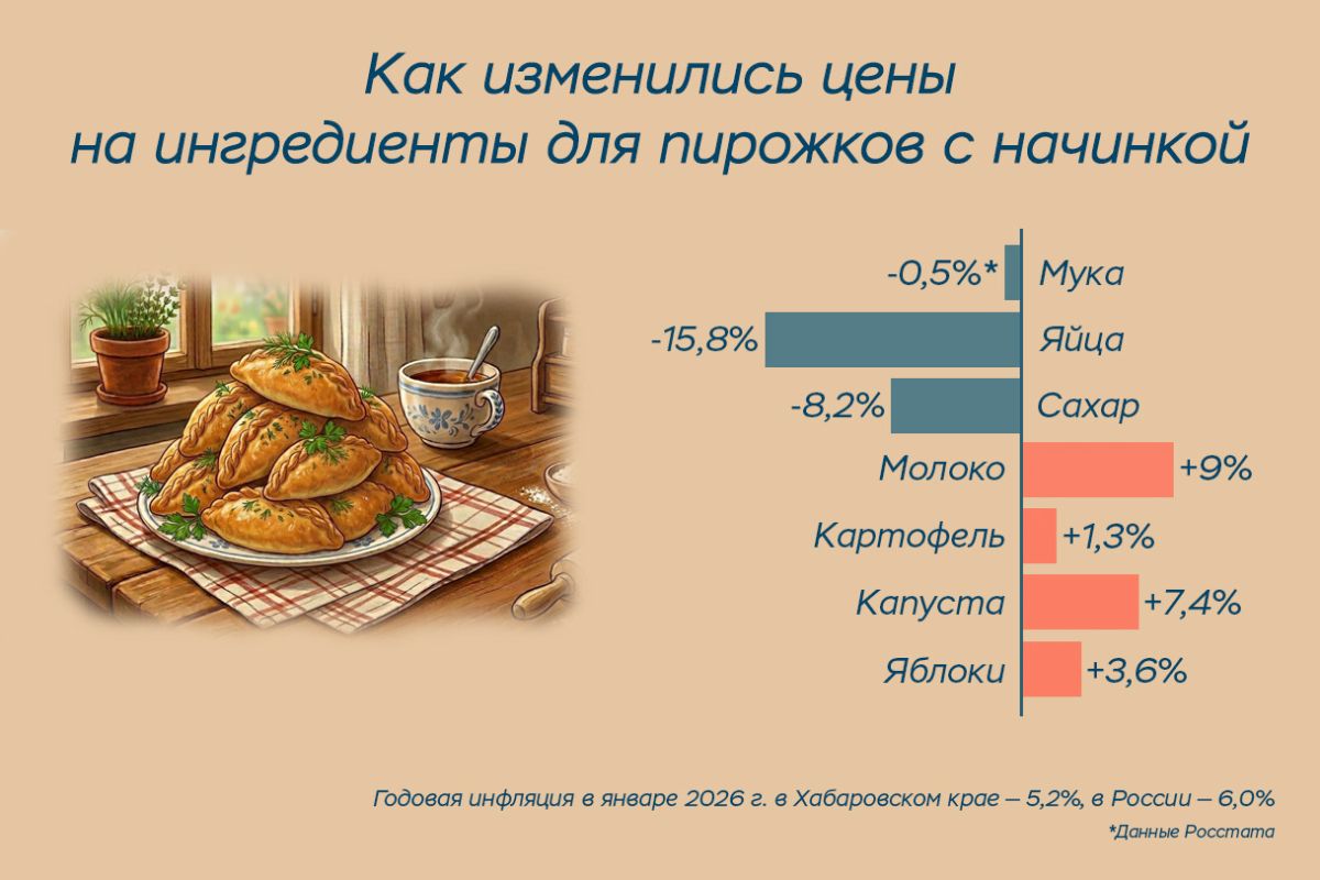 С чем у вас связаны воспоминания о бабушке? Конечно, с теплом и уютом. Это вязаные носки и варежки, неспешные разговоры и тот самый аромат домашней выпечки, который встречал вас еще у порога. Экономисты Отделения Банка России по Хабаровскому краю посчитали, как за год изменились цены на ингредиенты для пирожков с разными начинками. Для расчета использовались данные Росстата за январь 2025 и январь 2026 годов.
