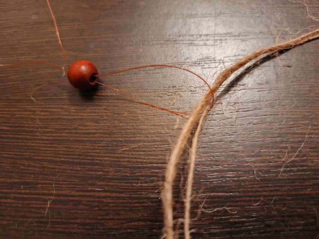 Легко продеть шпагат в бусину нам поможет кусочек обычной лески. Сворачиваем леску пополам и петельку просовываем в отверстие бусины. Затем в петлю вставляем двойную нить шпагата и, потянув за хвостик лески, протягиваем шпагат сквозь отверстие. Кстати, таким способом можно легко собрать бусины для браслета или чокера.