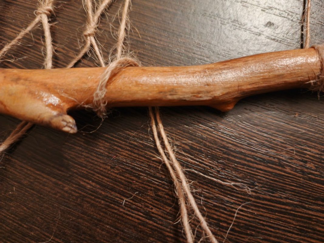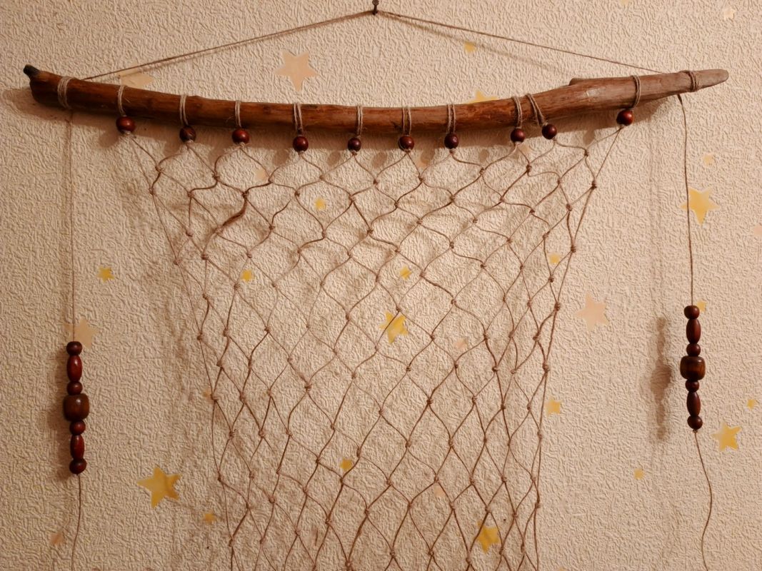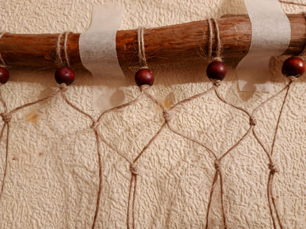Вяжем до нужной длины и закрепляем нижнюю планку. Если вы взяли не ровную фабричную рейку, а природный материал, учтите направление изгибов и роста вашей веточки. Она может и не совпасть с расположением ячеек. Например, у меня один край оказался впритык на последнем узле, а ближе к противоположному концу «хвосты» сетки были уже довольно-таки длинные.