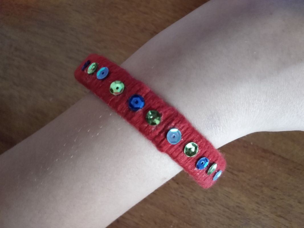 По желанию украшаем наш браслетик, приклеивая к нему стразы, пайетки, тесьму или бусинки. Если нет подходящего клея, украшения можно пришить. При этом, если вы будете использовать контрастные к основному цвету нитки, браслет приобретёт ещё больший шарм.