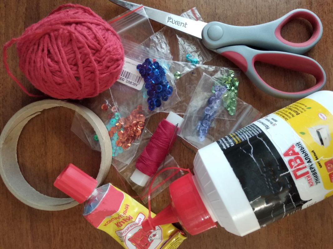 - Для украшения браслета: бусинки, пайетки, бисер, тесьма и тому подобное — по желанию.