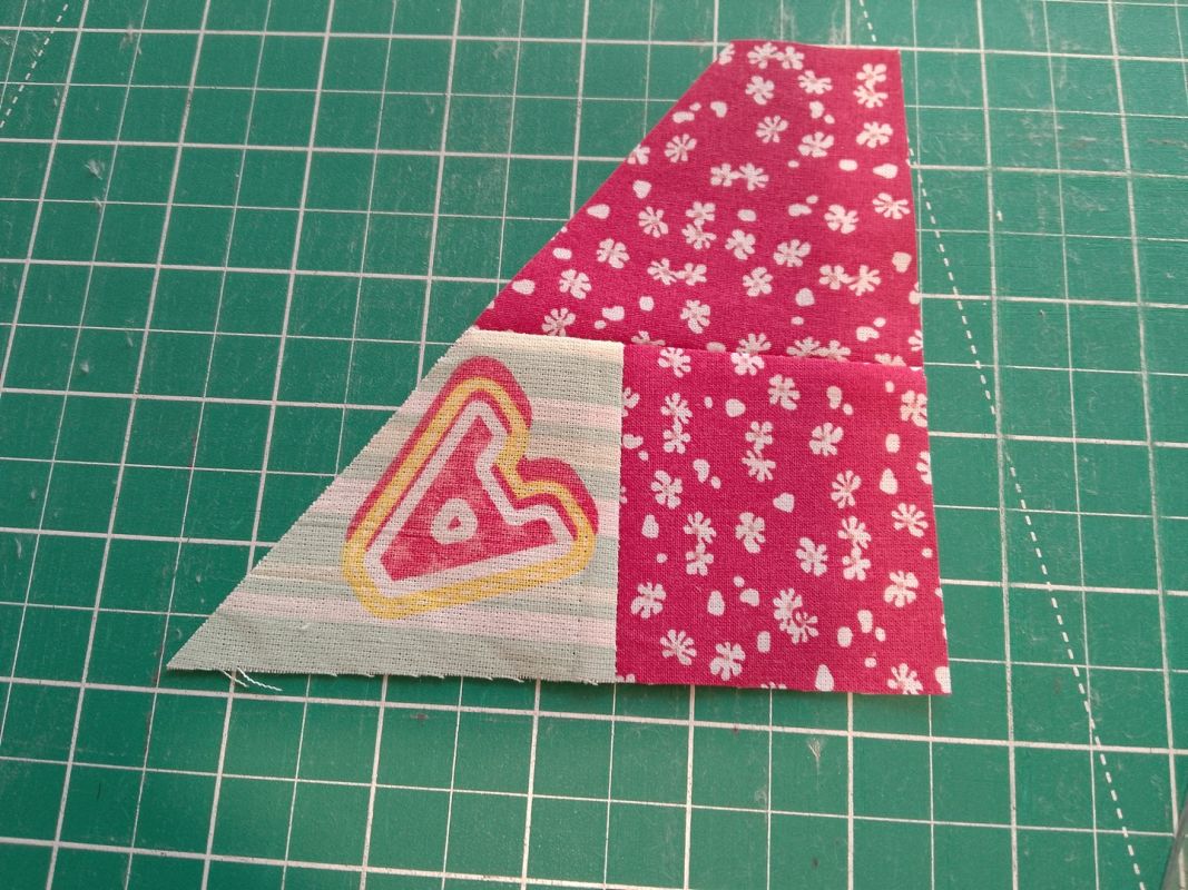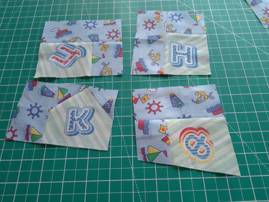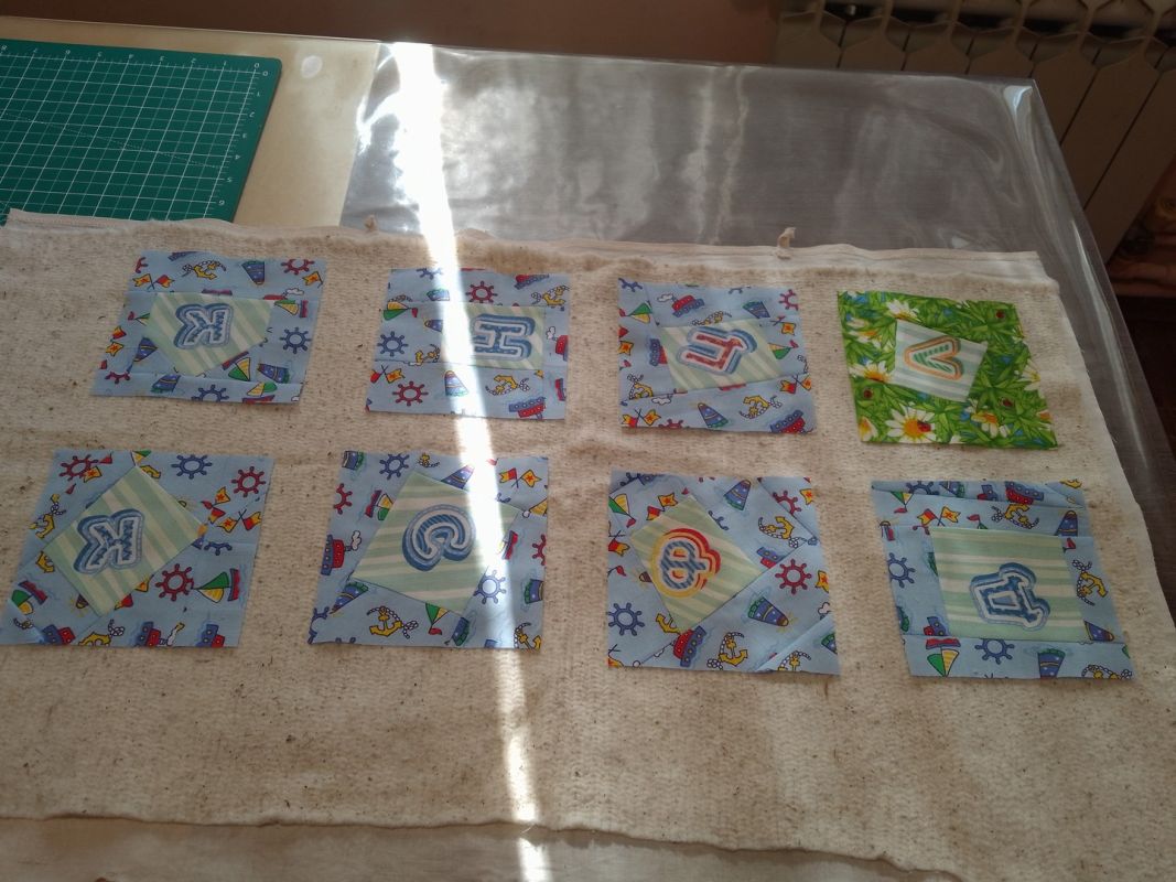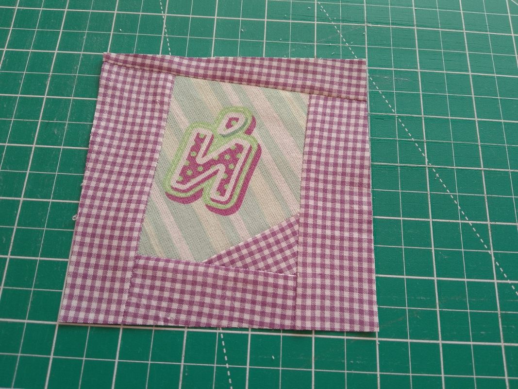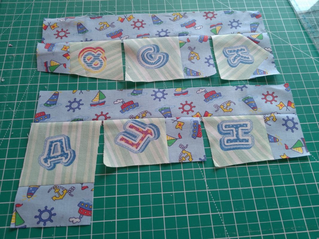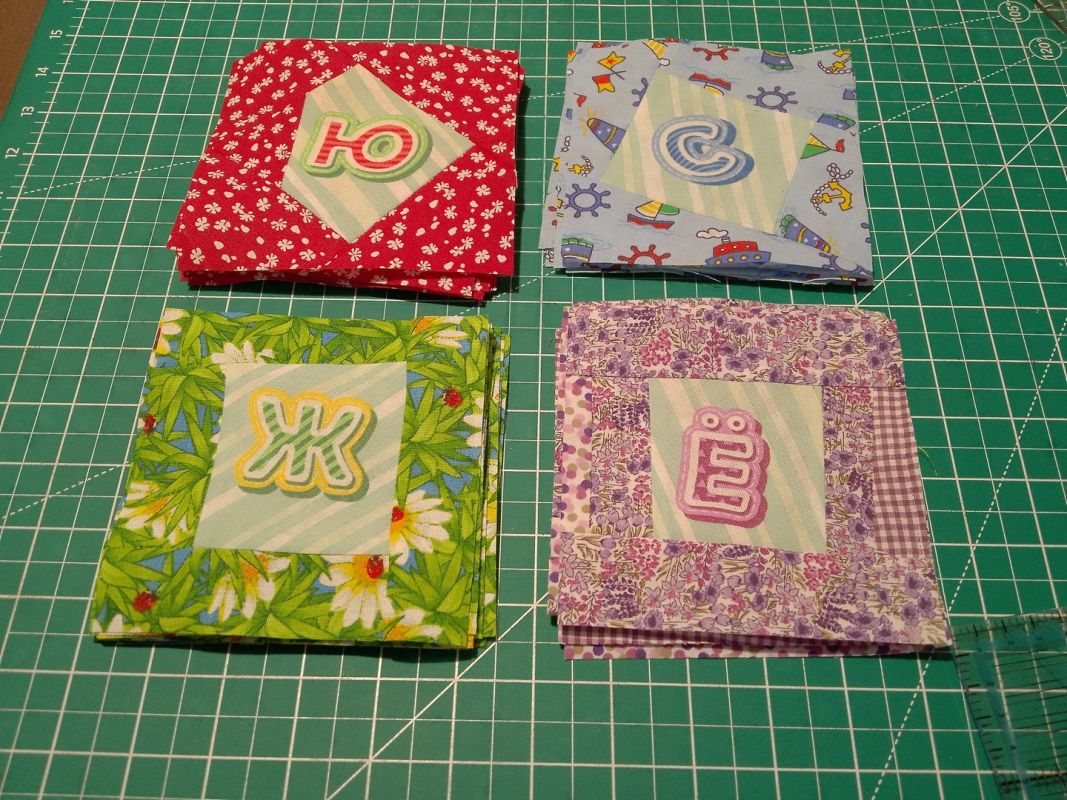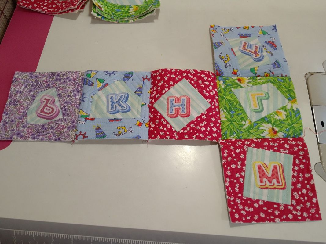 Выравниваем все заготовки, стараясь обрезать их так, чтобы буквы располагались вертикально, снизу вверх. Даже если для этого придется обрезать заготовки по диагонали. Если при этом окажется, что где-то не хватает уголка, не беда. Пришиваем лоскуток, выбрав его из образующихся обрезков, разглаживаем и выравниваем до квадрата.