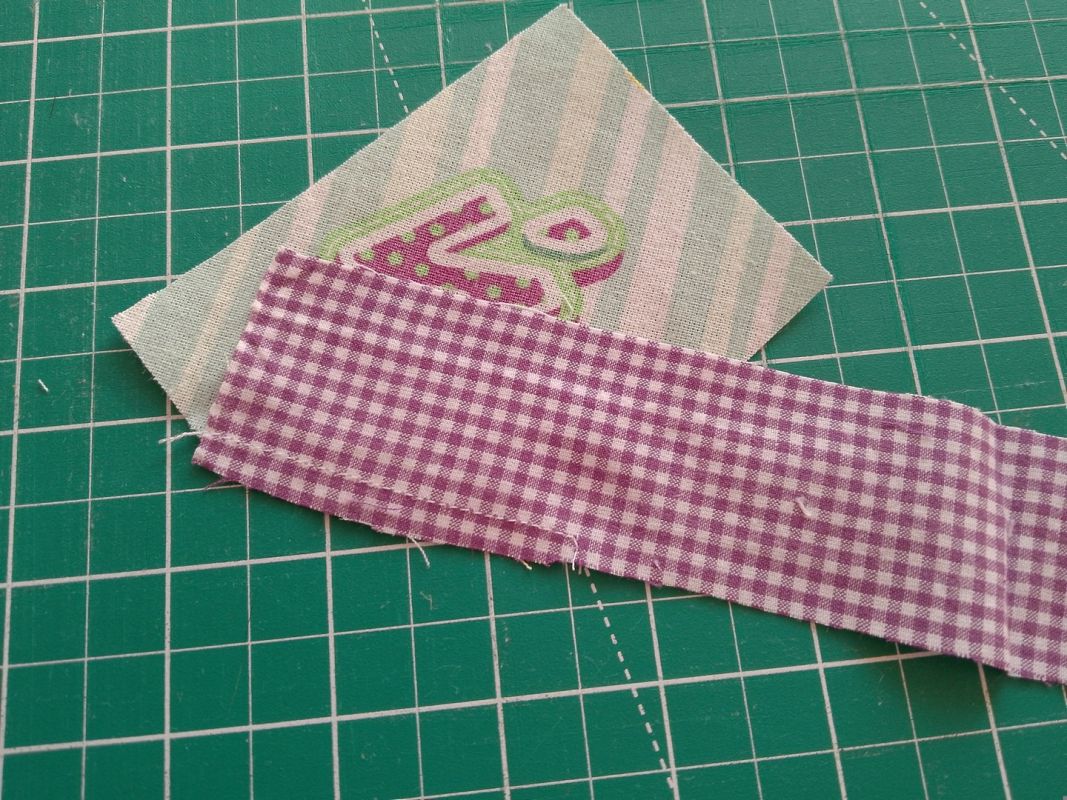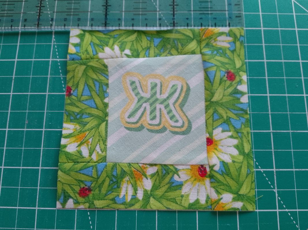 Следующий этап — швейная машинка, утюг, обрезка. Это означает: пришила к полоске фоновой ткани фрагмент с буквой, заутюжила шов, обрезала лишнее. Затем следующая сторона — пришила, разгладила, отрезала. И так, пока фрагмент не будет обшит со всех сторон до нужного размера. Запас сверх искомых 12,5 см с каждой стороны желательно получить по 2-3 см.