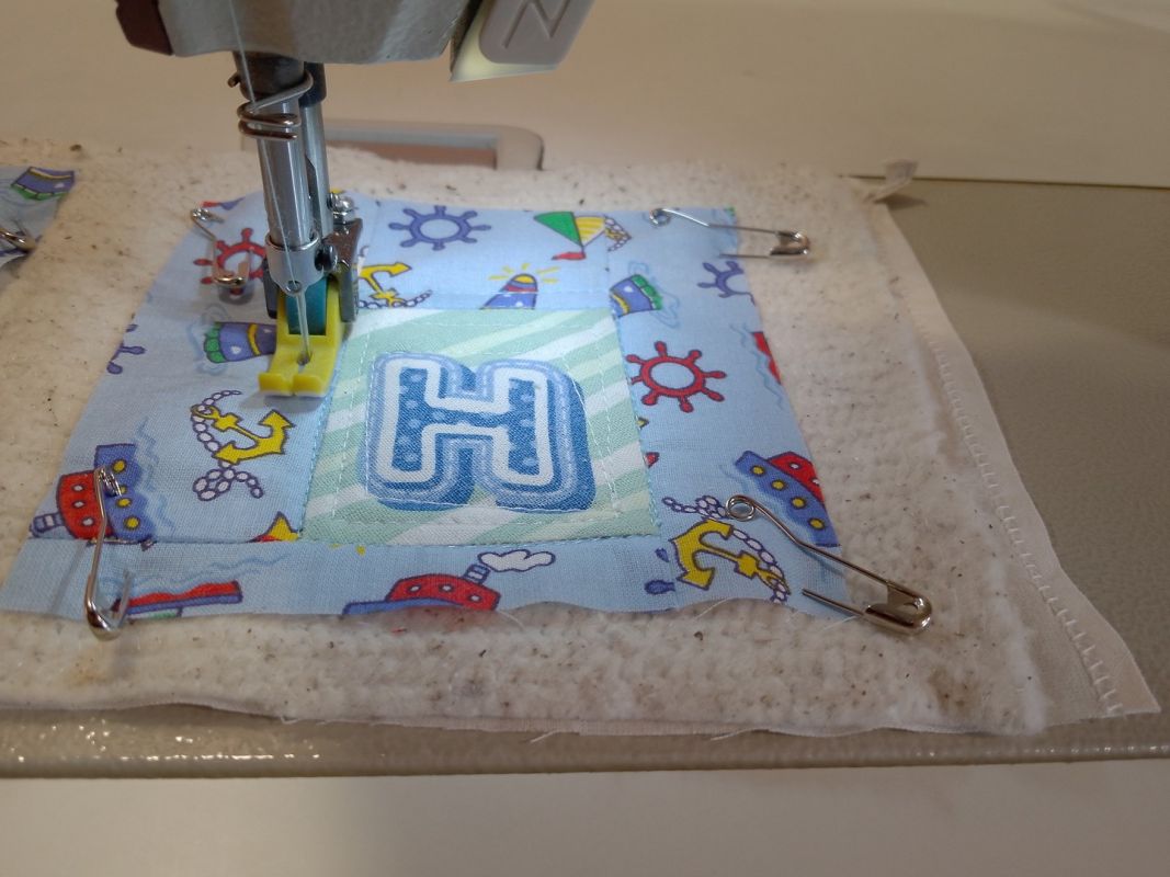 Далее — стежка. На обычной машинке, прямым швом, на ширину лапки, по периметру вокруг фрагментов с буквами, нитки в тон. Стегать реже не советую — это нужно не только для скрепления слоев, но и для придания жесткости изделию.