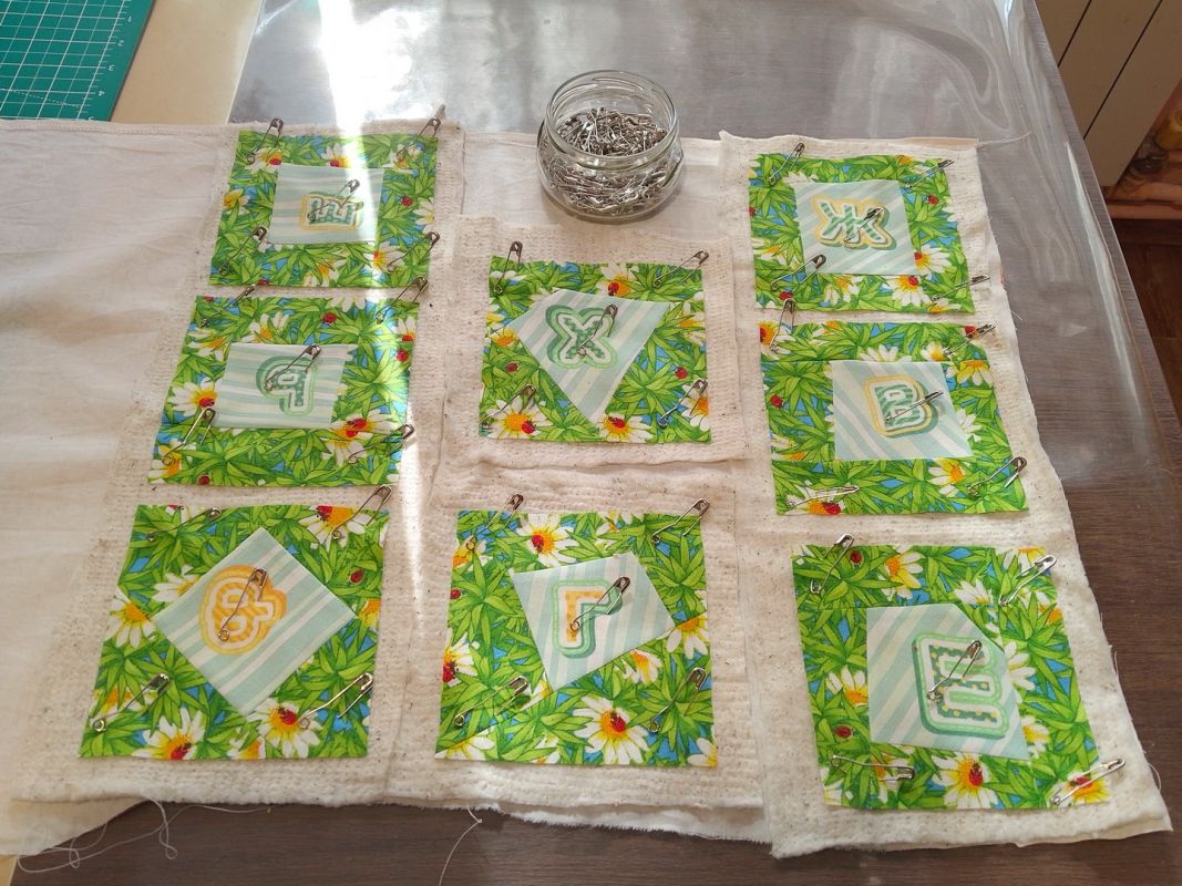 Заканчивается полоска фоновой ткани, берем следующую и продолжаем. А вот когда уже все фрагменты будут нашиты, можно идти к утюгу, затем на обрезку. Обрезали лишнее — возвращаемся к швейной машинке и так же конвейером нашиваем фрагменты букв следующей стороной.