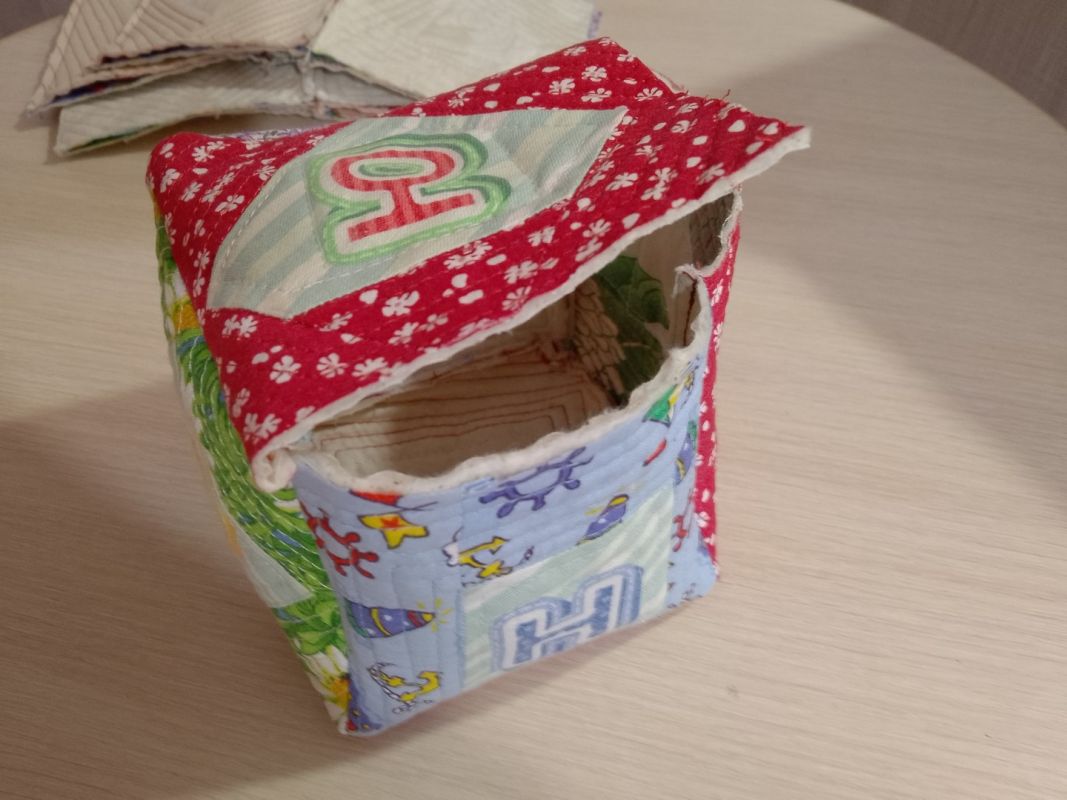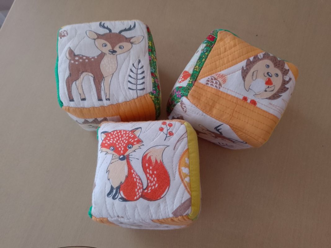 Вкладываю его стопкой через оставленный незашитым край внутрь кубиков. Прореху зашиваю ручной иглой двойной ниткой потайным швом. Кубики готовы. У меня получилось шесть штук. Но ткань с буквами и поролон еще остались. Я посчитала, сколько еще могу вырезать букв, прикинула количество поролона — набралось еще на 11. Сошью — отнесем в детский сад, который посещают мои внуки. Пусть играют все вместе.