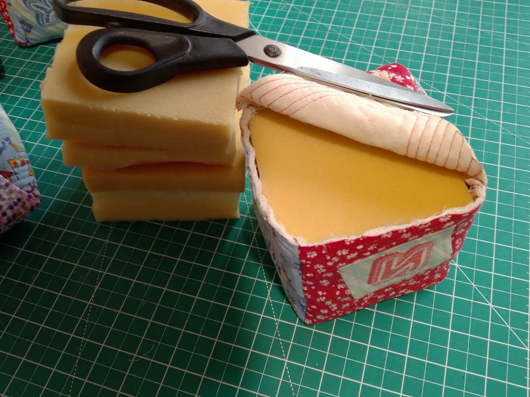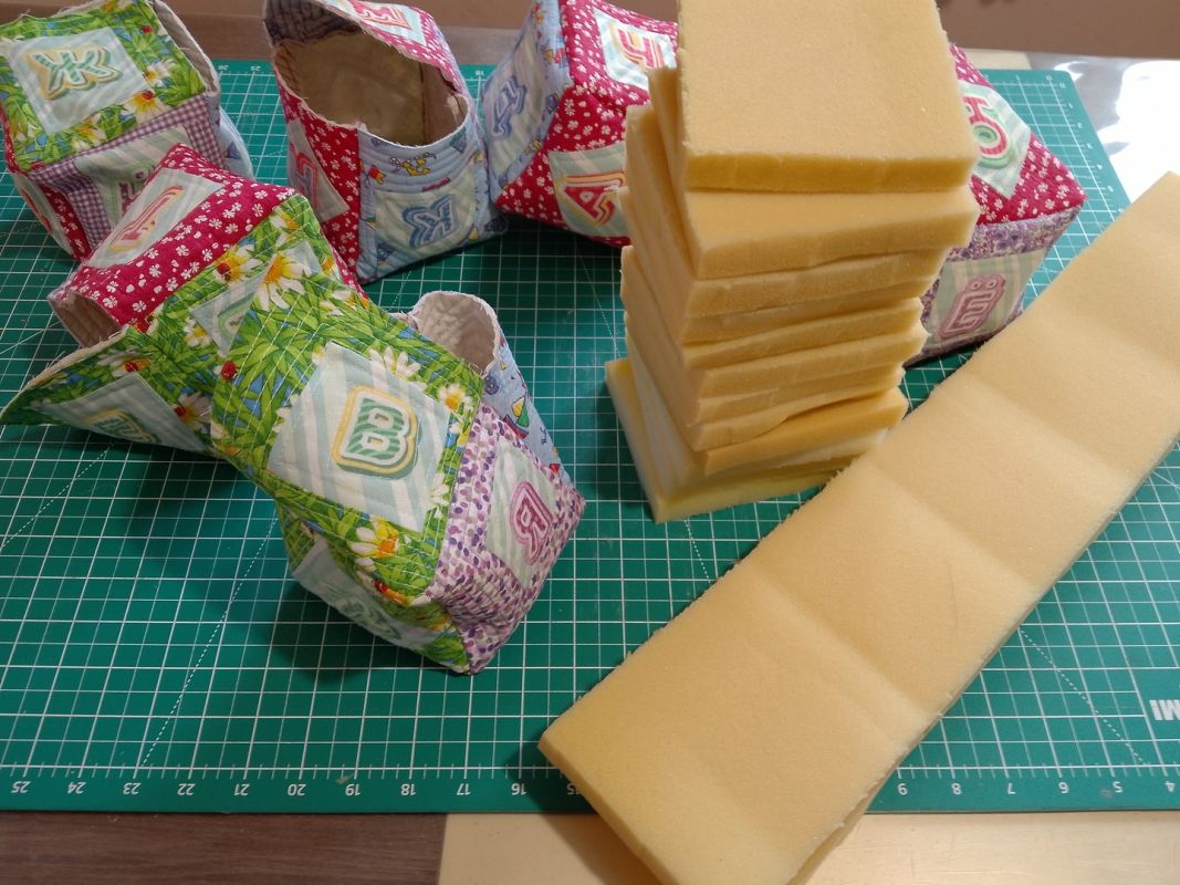 Предпоследний этап — наполнение. Поролон разрезаем на квадраты со стороной 11 см. На один кубик потребуется 6 квадратов поролона. Он толщиной 2 см, итого 12 см в высоту, как раз уплотнится, и кубик будет лучше держать форму.