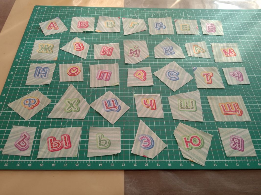 Однако хватит ли разнообразия? Стала вырезать букву за буквой — фрагменты в виде трех-, четырех— пятиугольников, как рисунок позволяет. И по итогу выяснилось, что с двух небольших отрезов ткани собрался весь алфавит. Это знак! Вырезала еще три буквы, чтобы хватило на шесть кубиков.