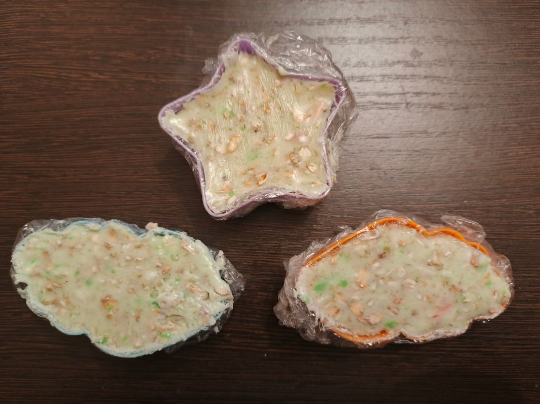 Тщательно перемешиваем растопленное мыло с основой скраба и раскладываем по заранее подготовленным формочкам.