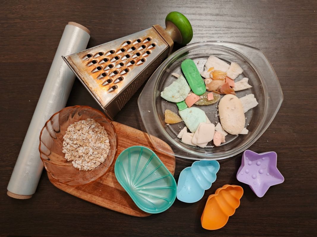 Итак. Соберите кусочки старого мыла и натрите их на крупной тёрке. Высыпьте в посуду для микроволновки и добавьте воды. Если вы хотите на выходе получить цветное мыло, можно добавить пищевой краситель.